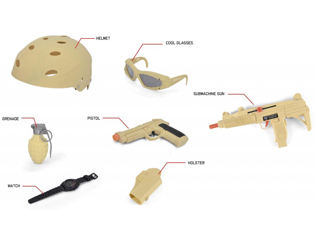 A szett tartalma: sisak, szemüveg, automata fegyver, pisztoly, gránát, óra, pisztolytáska