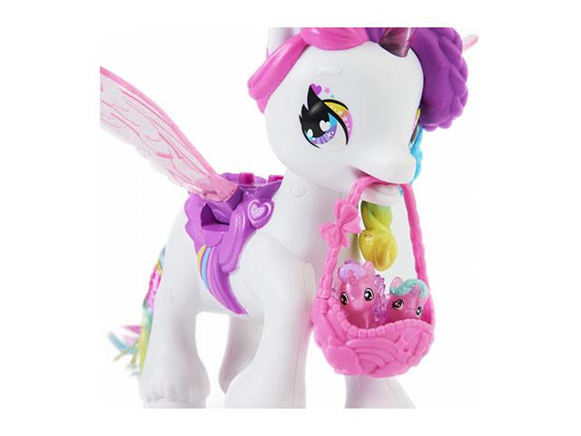 Ezzel a csodálatos állattal, pontosabban unikornissal sok ideig fognak játszani a kislányok, hiszen tökéletes kialakításának köszönhetően rögtön elnyerik a kicsik tetszését. A varázslatos ló megismerhetik, összebarátkozhatnak vele, elnevezhetik tetszésük szerint és nemsokára legjobb barátjuk lesz. A szárnyas állaton kívül a szettben két kis bébi unikornis is helyet kapott, hogy még érdekesebb legyen a játszás. A figura csapkodni tud a szárnyaiból és egy gomb lenyomásával dallamokat is el tud játszani. A kosarat a szájába lehet helyezni, amely hatására más hangokat ad ki.