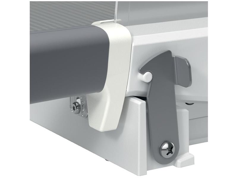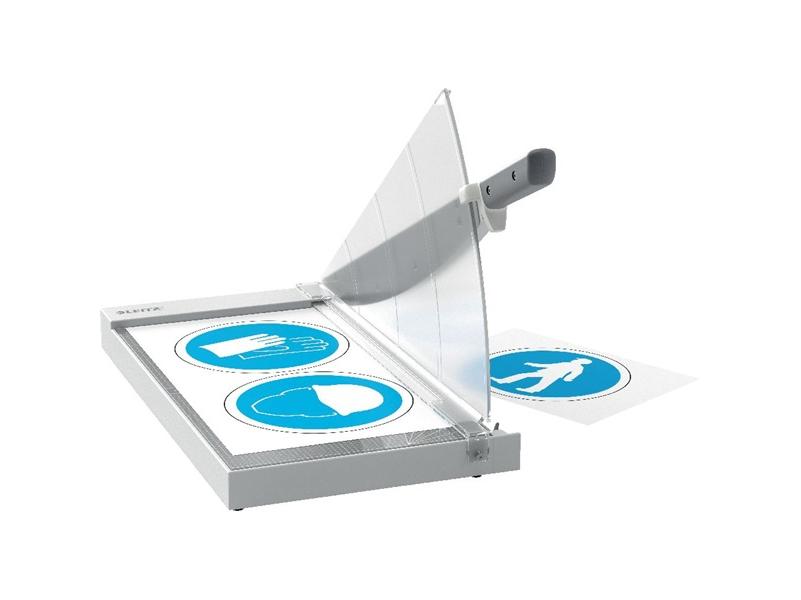 Az átlátszó, kézi papírleszorító biztosan rögzíti a papírt, míg az ergonomikus fogantyú kényelmes és könnyű vágást biztosít. Sima, üveg munkafelület a lapok gyors és egyszerű igazításához. A védőlemez teljes védelmet nyújt a vágás során, míg a vágókés biztonsági zár lezárva tartja a vágókést, ha nincs használatban.