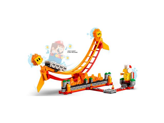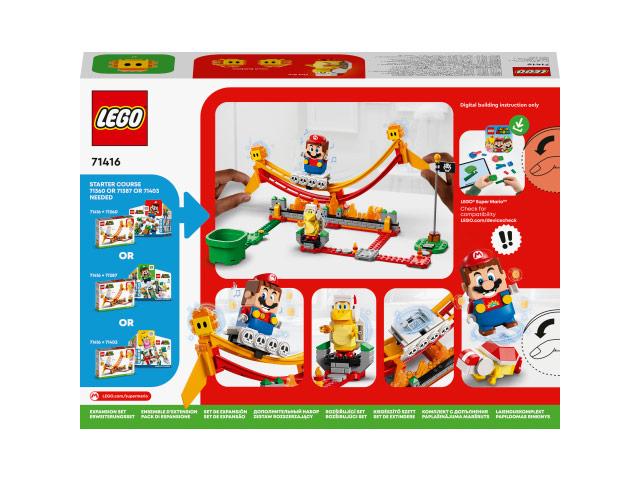 A gyerekek vörösen izzó pályával bővíthetik LEGOŽ Super Mario™ világukat a Lávahullám-lovaglás kiegészítő szettel (71416). A készlet egy ingadozó lávahullámot és lávaliftet tartalmaz, amit egy LEGOŽ Mario™, LEGOŽ Luigi™ vagy LEGOŽ Peach™ figura (a csomag nem tartalmazza) meglovagolhat. A játékosok digitális érméket szerezhetnek, ha nem esnek le a mozgó hullámról, és ha legyőzik a két végén található 2 Lávabuborékot. A közös játékhoz is ideális szett egy Fire Brót is tartalmaz, akit szintén legyőzhetsz.