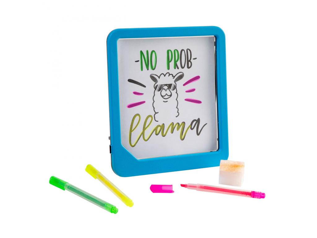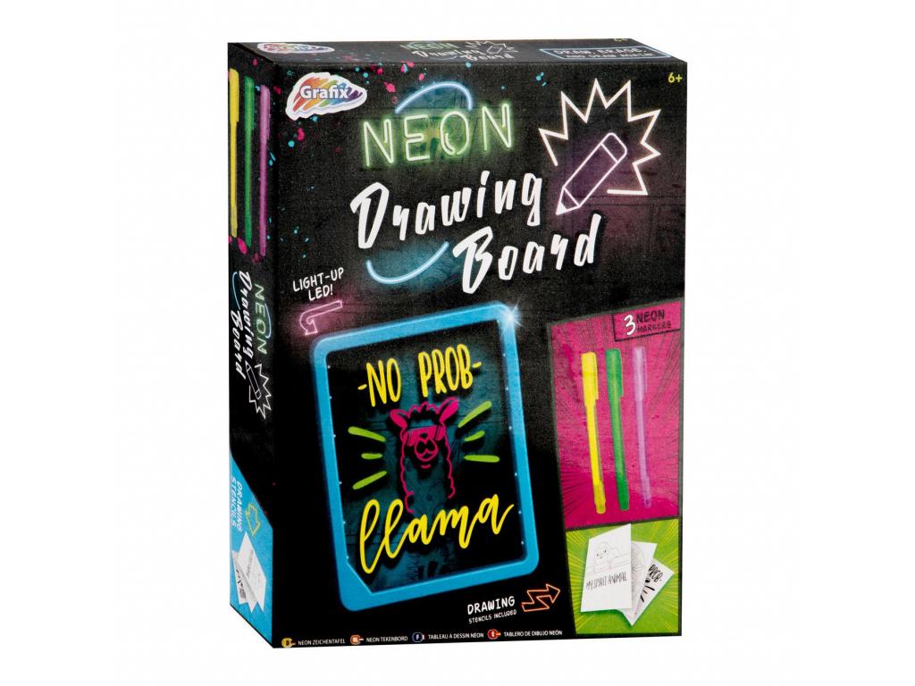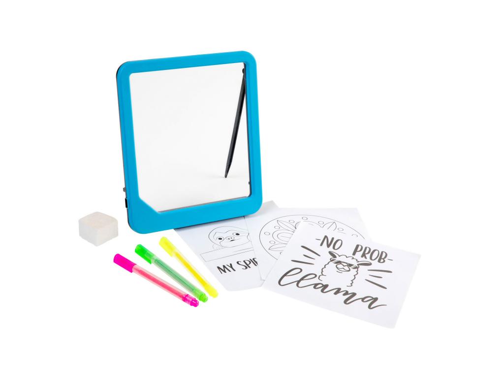 A készlet tartalmaz egy rajztáblát, három neon jelölőt, egy szivacsot és 3 rajzsablont.