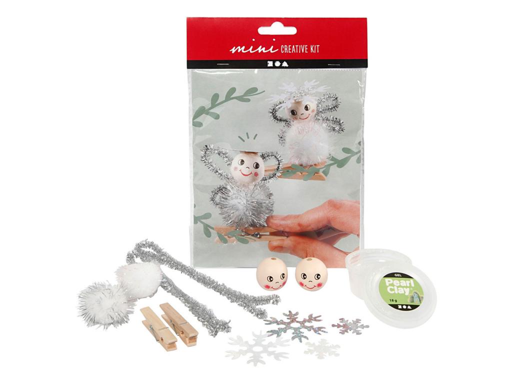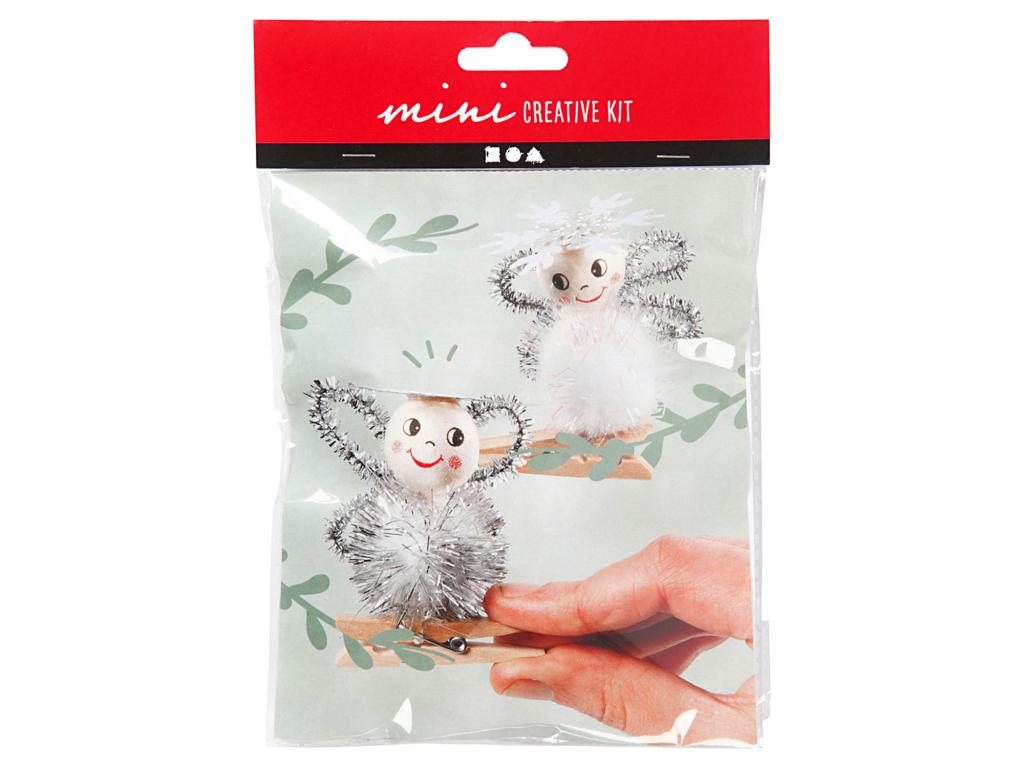 Anyagkészlet angyalkák készítéséhez fa ruhacsipeszek, fém pomponok és zsenília felhasználásával.