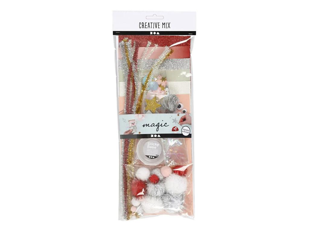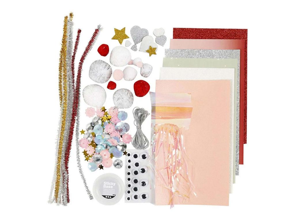 Tartalom: Sticky Base, flitterek, pomponok, csillámpapír, nyomtatott papír, fém csőtisztító, irizáló celofán flitter, öntapadós kacsázószemek, ezüst zsinór és EVA habfigurák csillámmal.