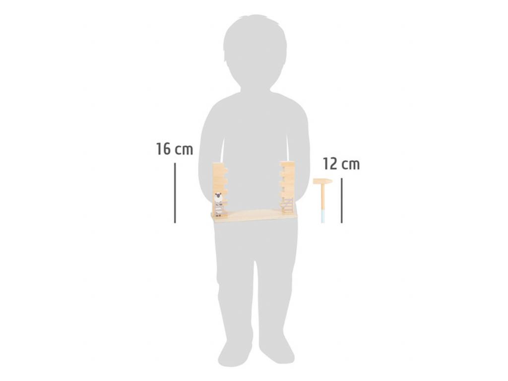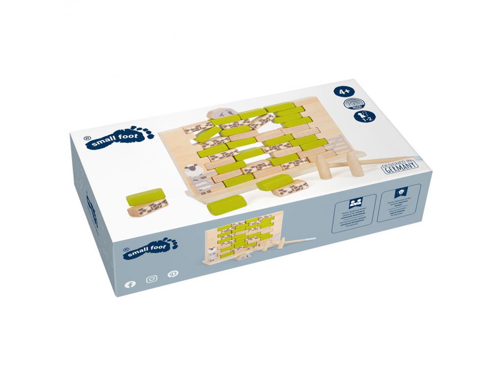 Ez a partijáték egyedül vagy csoportosan is játszható, és különösen gyermekbarát kialakításával és nagy mennyiségű látható fa anyagával nyűgöz le. A billegő fal további játékkörökre is ösztönöz, és hosszan tartó szórakozást biztosít. Ki fogja az első blokkot eltávolítani a falról?