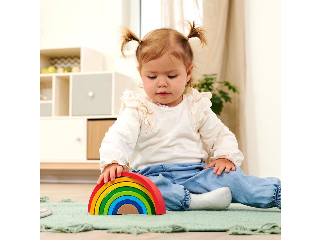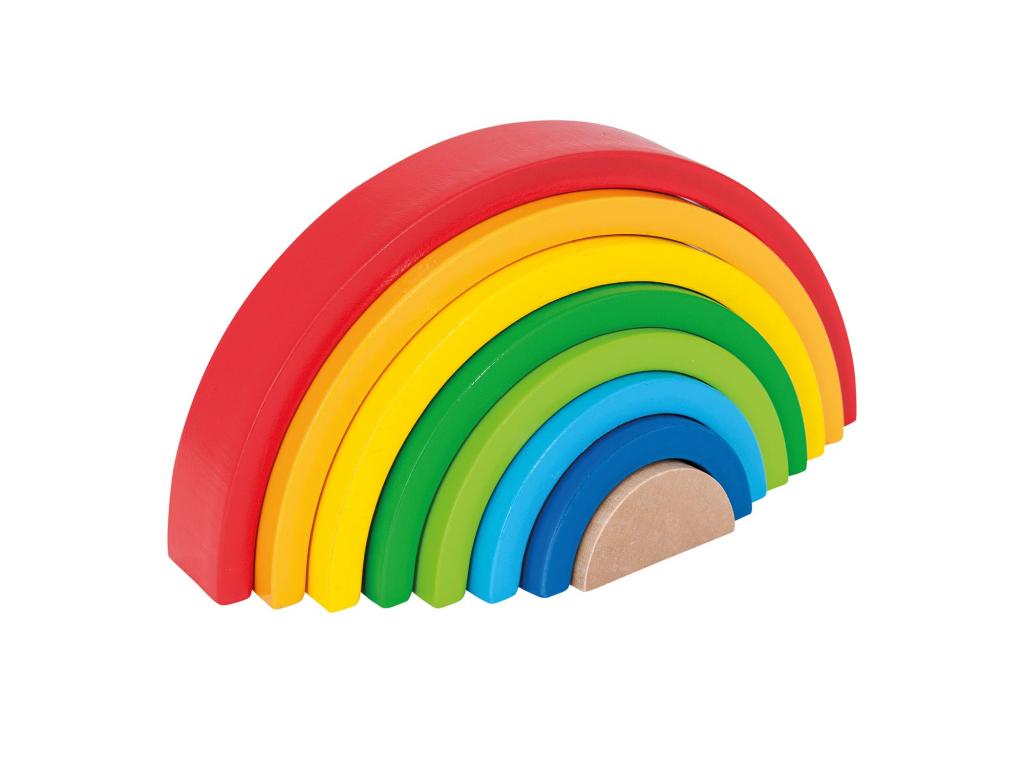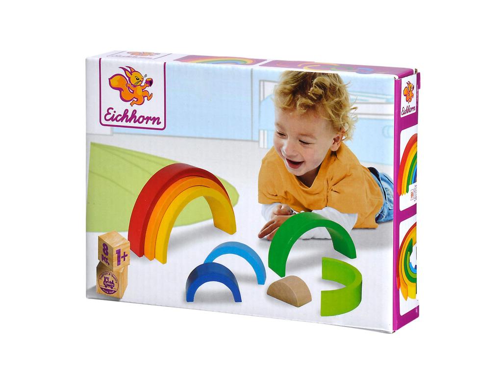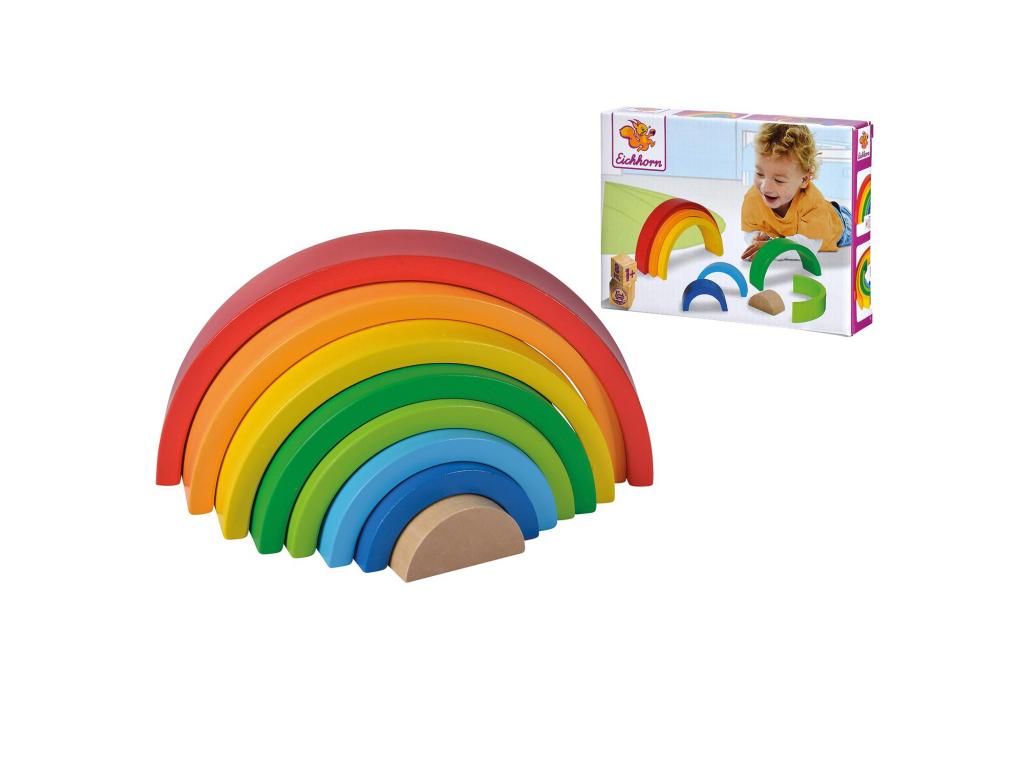 Fából készült rakosgatható szivárvány az Eichhorn cégtől kisgyermekeknek és óvodásoknak. A fából készült rakosgatható szivárvány 8 színes részből áll, amelyek mindegyike más-más méretű és színű. Rakd őket egymásra egy gyönyörű szivárvánnyá, vagy építsd meg velük saját építményeidet! A rakosgatható szivárvány 19,5 centiméter magas, és masszív fából készült. Gyermekeknek 1 éves kortól alkalmas.