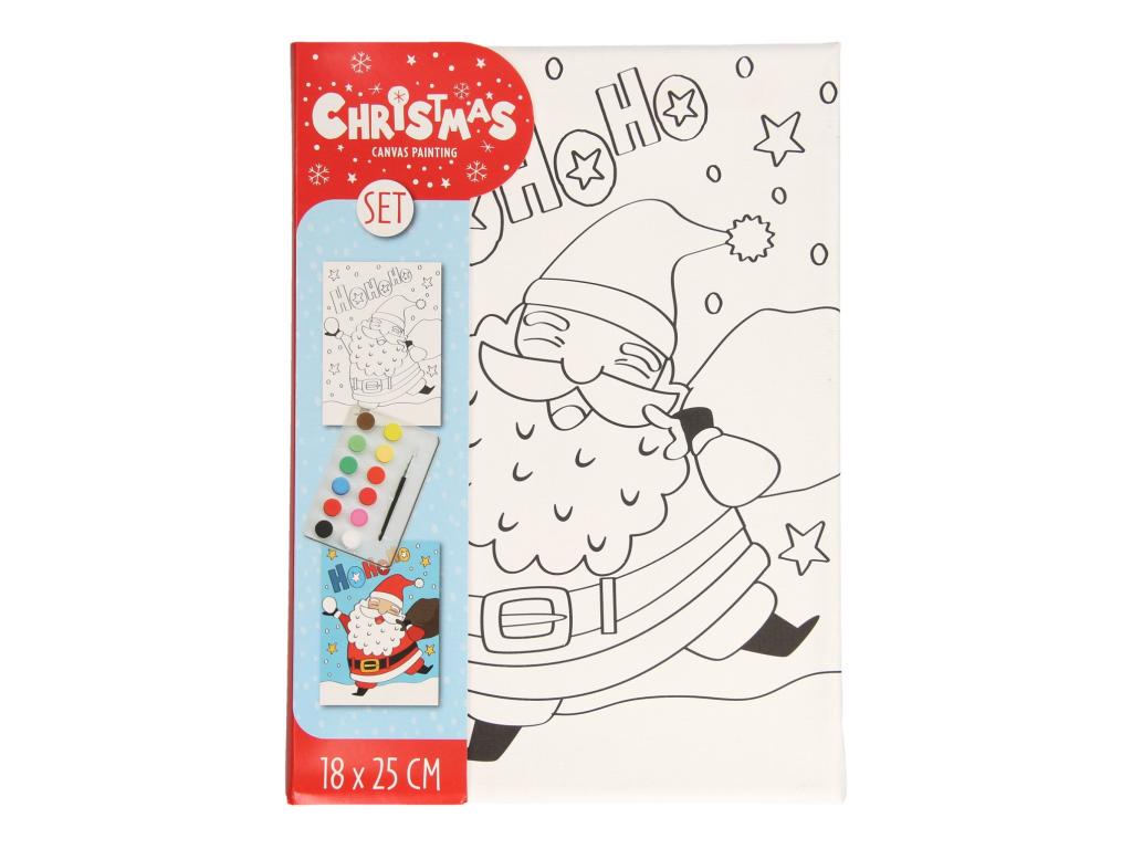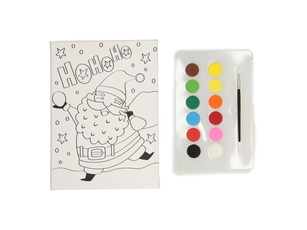 Festőkészlet Mikulás nyomatú vászonnal és 12 színű akvarell festékkel, ecsettel. A vászon mérete 25x18 cm.