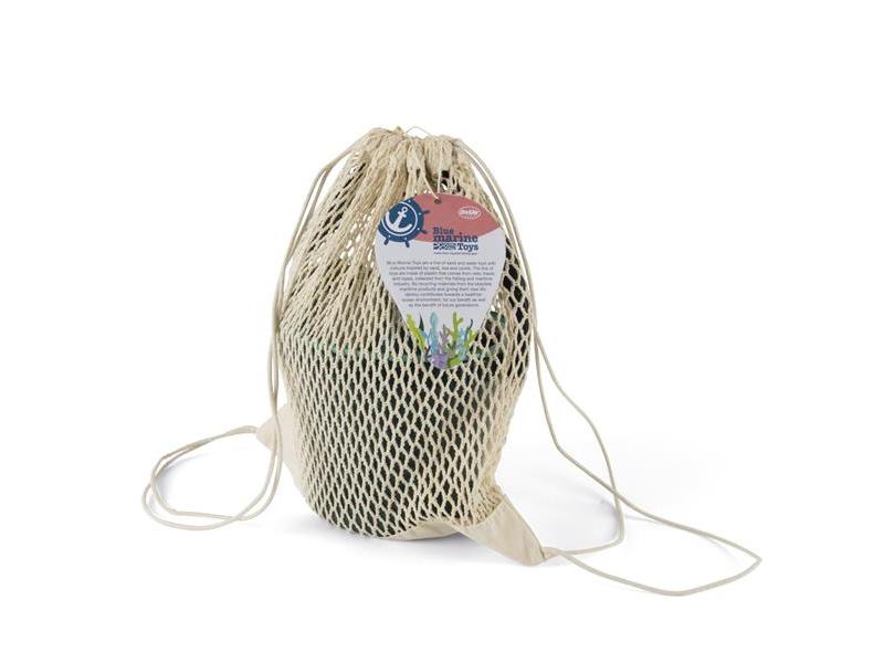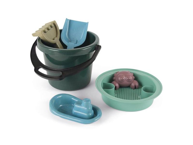 Mérete 25,5 x 23 x 27,5 cm (hálóban), vödörkészlet újrahasznosított műanyagból, vödörből, szitából, lapátból, gereblyéből, halformából és mini csónakból áll