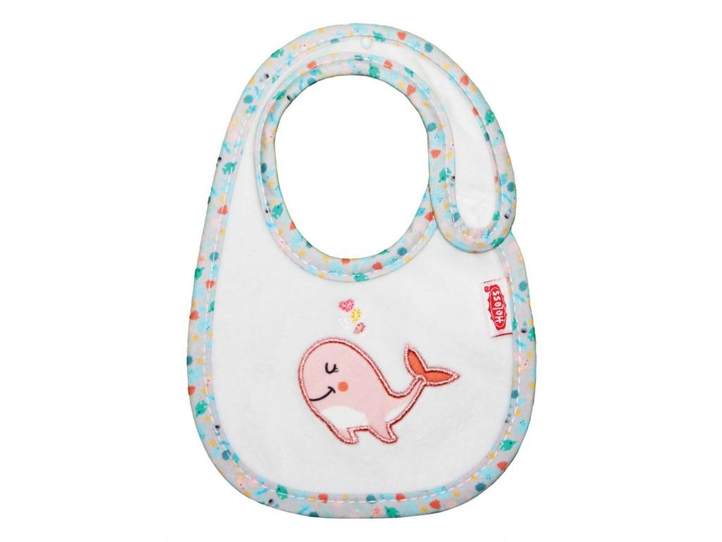 Fehér/pöttyös előke a Heless cégtől korallpiros bálnanyomattal. Puha velúrból készült, tépőzáras záródással. Gyermekeknek 18 hónapos kortól alkalmas. Méret: 18 x 12,6 cm