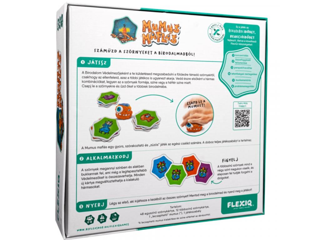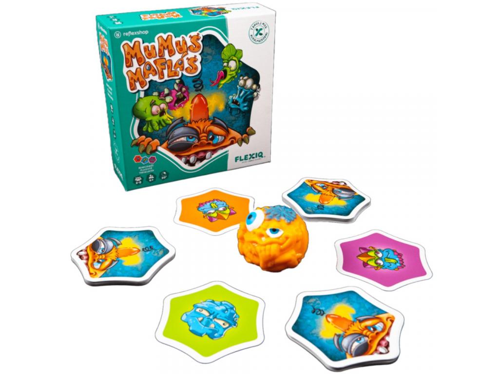 A "Mumus Maflás" egy izgalmas, gyors tempójú társasjáték, ahol a játékosoknak a Birodalom védelmezőiként kell fellépniük a mumusok és szörnyek ellen. A játékban különféle formákat és színeket kell párosítani, ahol a sebesség döntő. A játékban a cél, hogy legyőzd a szörnyeket. Először is a központi szörnyet helyezzétek az asztal közepére. E köré tegyetek három további szörny lapot, a maradékot pedig osszátok szét egyenlő arányban. A lapjaidat mutasd meg mindenkinek, majd párosítsd az egyik központi laphoz. Minden lap megfordításánál keress egyező kombinációkat. Ha találsz egyet, zúzd szét a központi szörnyet és űzd el az ellenfelek szörnyeit!