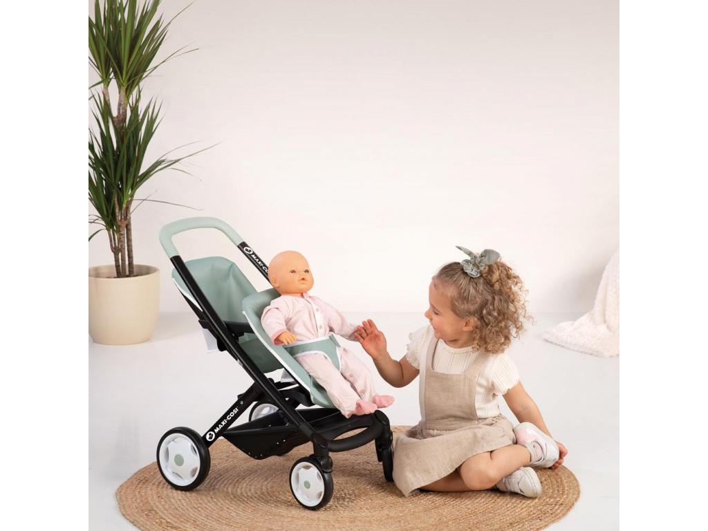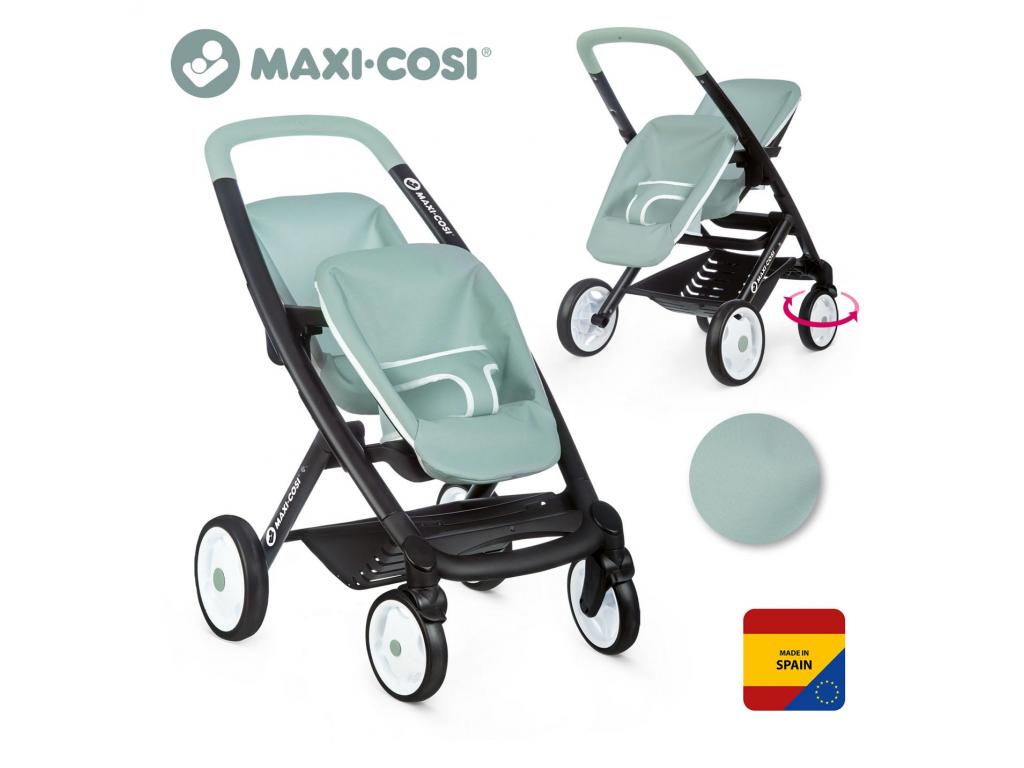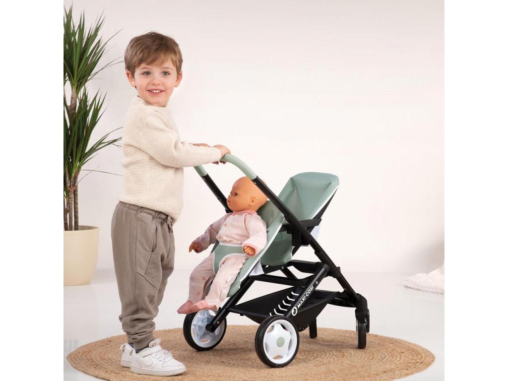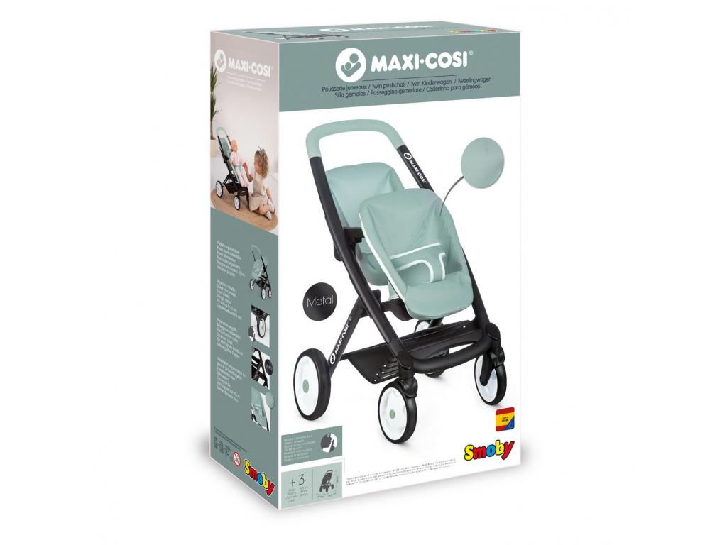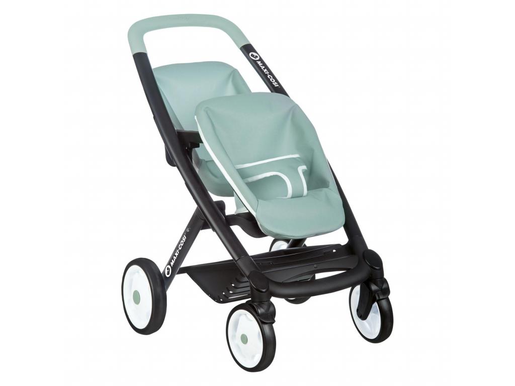 Duo babakocsi a Smoby + Maxi-Cosi cégtől, melyben 2 baba fér el 42 centiméterig. A masszív fémváz hangelnyelő görgőkkel és ergonomikus fogantyúkkal rendelkezik 65 centiméteres magasságban. A szövetborítás stílusos zsályazöld színű. Gyermekek számára 3 éves kortól alkalmas.