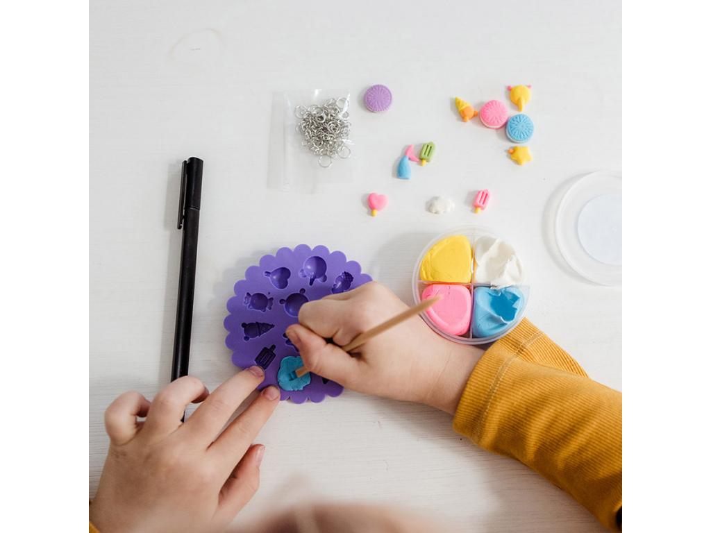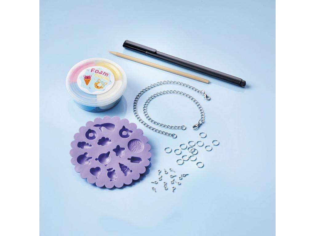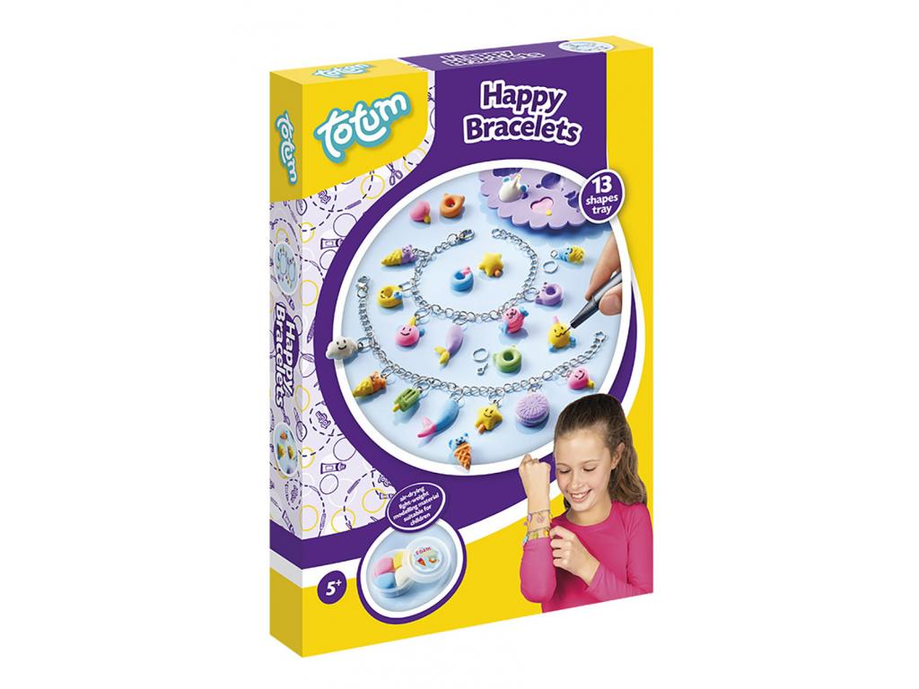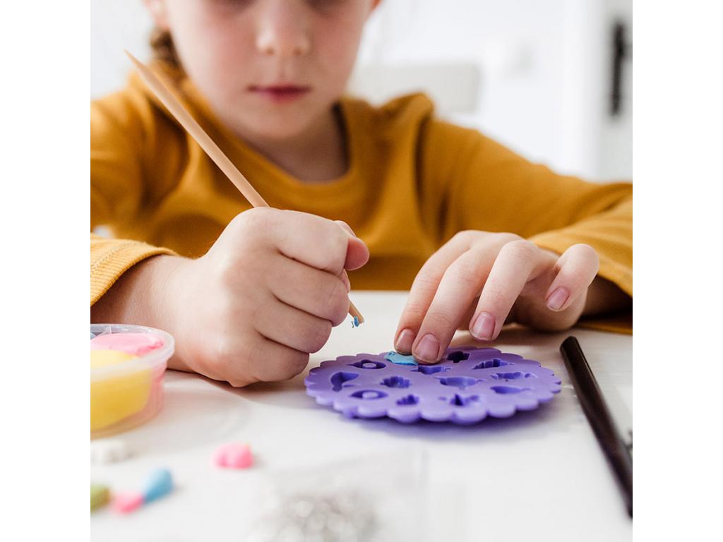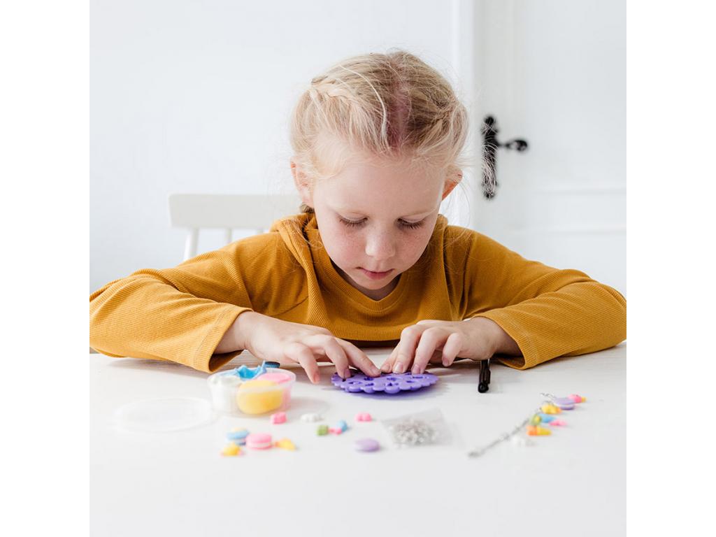 Kézműves készlet saját karkötők készítéséhez. Készítse el saját vidám medáljait agyagformákból, és díszítse a mellékelt tollal. 5 éves kortól alkalmas.