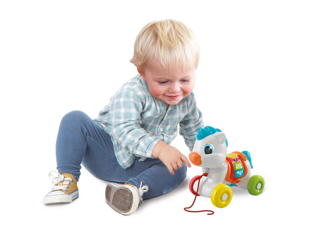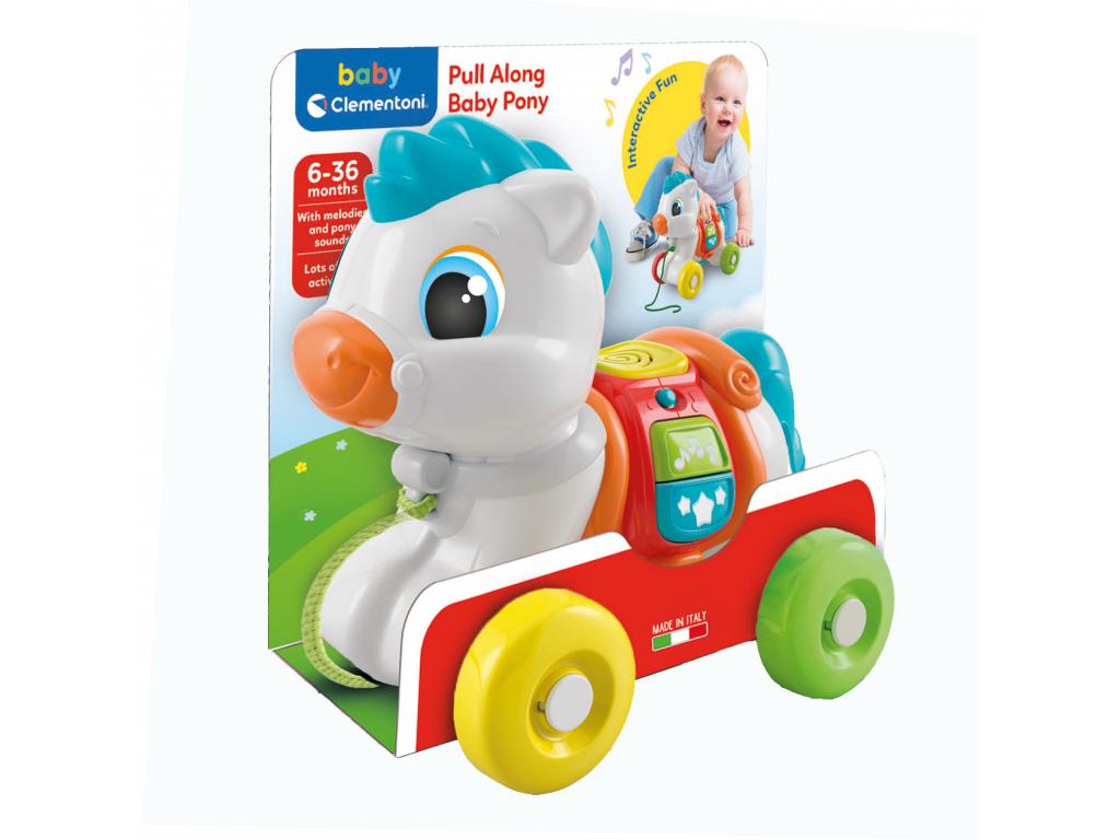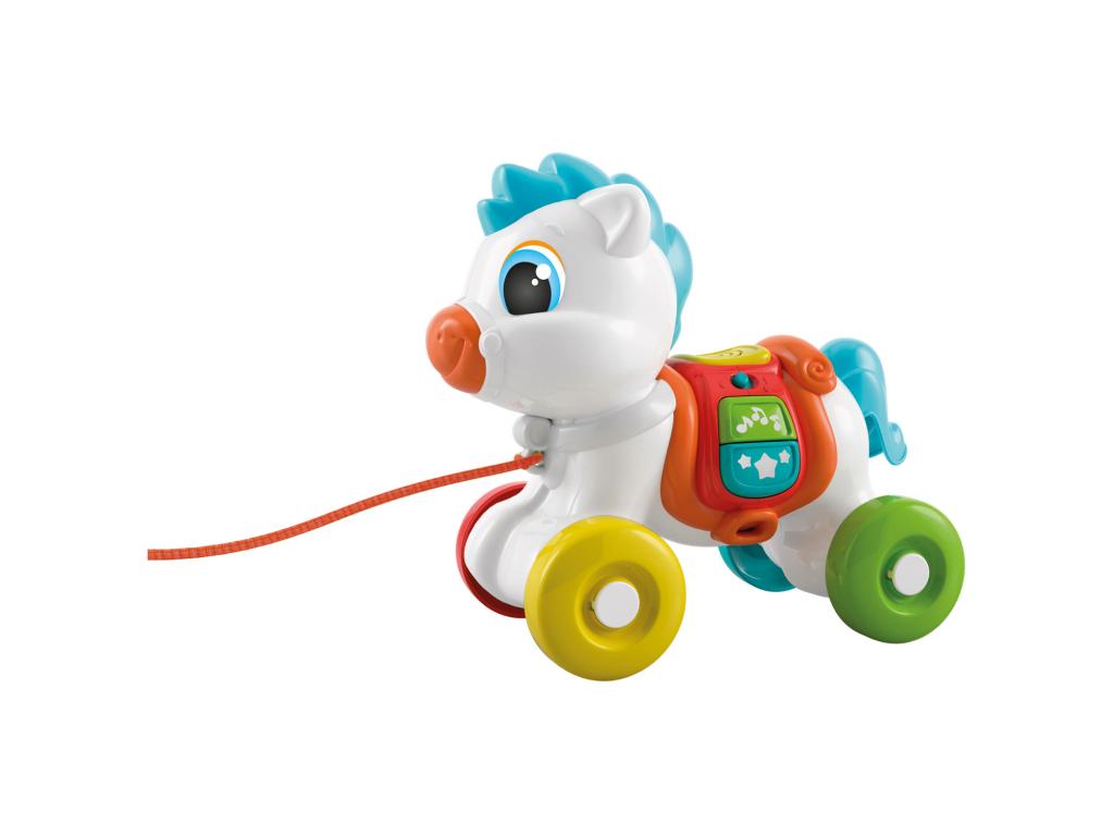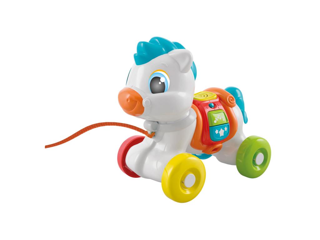 Egy nagyon édes húzható póni, amelyet mindig magaddal vihetsz. A nyergén lévő gombok megnyomásával a póni életre kel. Eszik, nevet és a hangeffektusoknak köszönhetően szórakoztatja a gyermeket. Az interaktív gomboknak, a kerekeknek és a kötélnek köszönhetően a póni támogatja az érzékszervi és motoros fejlődést. A Baby Clementoni termékcsalád ikonikus figurája, amelyet a gyerekek nagyon szeretnek. Olaszországban készült.