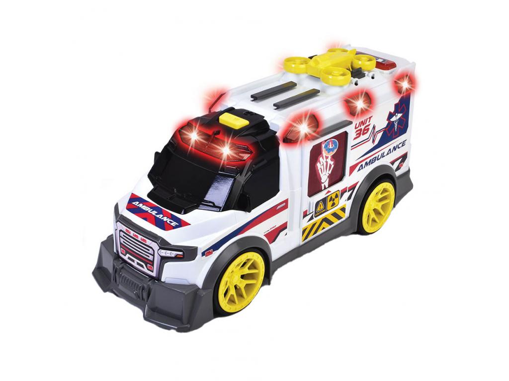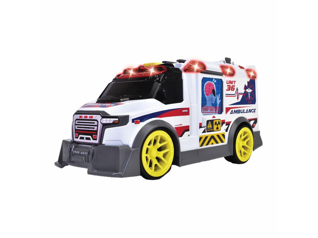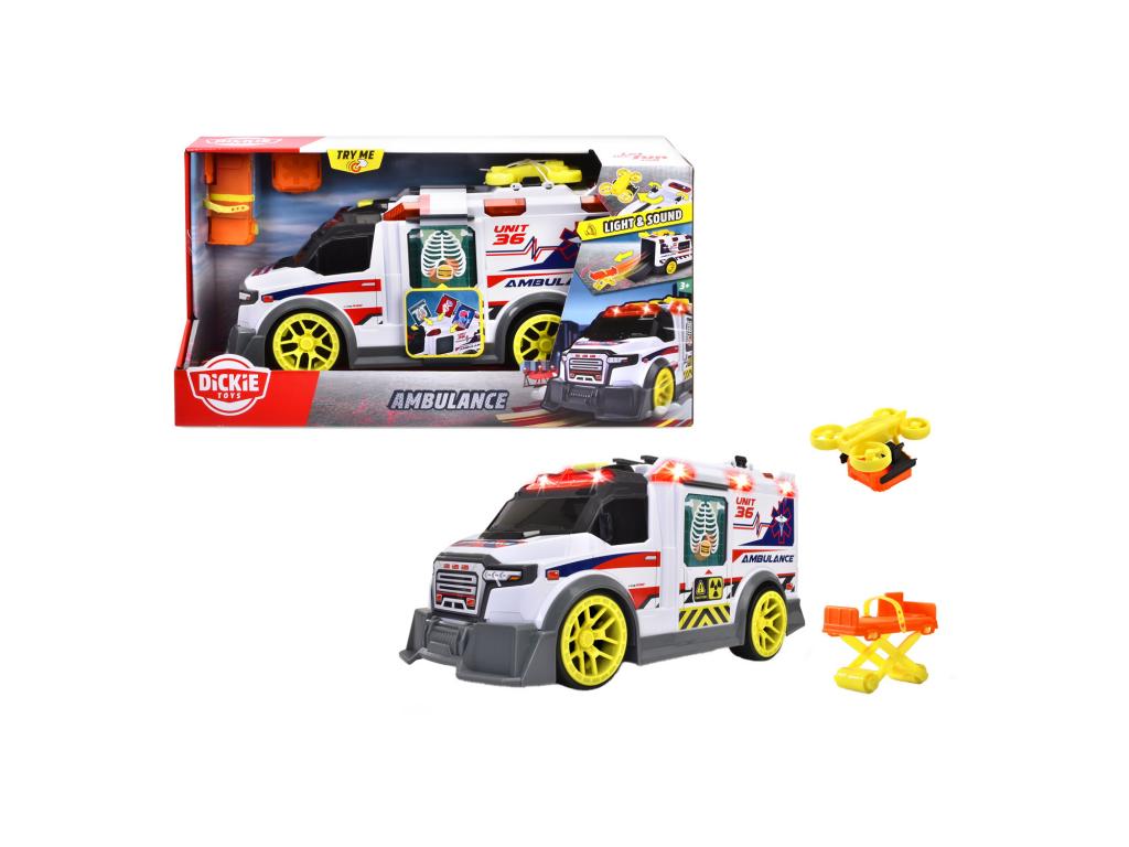 Dickie Toys - Nagy játék mentőautó számos tartozékkal (35,5 cm) - Mentőautó játék drónnal, tartozékokkal, fény- és hangeffektekkel. 3 éves kortól. Ez a Dickie Toys játék mentőautó futurisztikus kialakítású, feltűnő sárga kerekekkel. Emellett számos valósághű fény- és hanghatással is rendelkezik (2x 1,5 V-os AA elemmel), hogy egy tipikus mentési jelenet hangulatát idézze fel. Szórakoztató funkciók A mentőautó készlet három különböző röntgensugárral is rendelkezik a betegek diagnosztizálásához. Mindegyik kép egy-egy vicces történeten alapul és arra ösztönzi a gyermeket, hogy úgy tegyen, mintha. A készlet egy játék drónt is tartalmaz, amely elsősegélycsomagot tud szállítani, ha a mentőautó egy útlezárás vagy zord terep miatt nem tud eljutni a vészhelyzet helyszínére. Mind a drón, mind az elsősegélycsomag a mentőautó tetejére szerelhető, amikor nem használják. A játékhordágy egy gombnyomással kidobható a mentőautóból és legfeljebb 8 cm magas játékfigurák szállítására alkalmas (nem tartozék). A csomag tartalma: A mentőautó egy darabja, amely az alábbiakat tartalmazza: Mentőautó (35,5x13,5x18 cm), hordágy, drón, elsősegélycsomag, 3 diagnosztikai kártya és elemek.