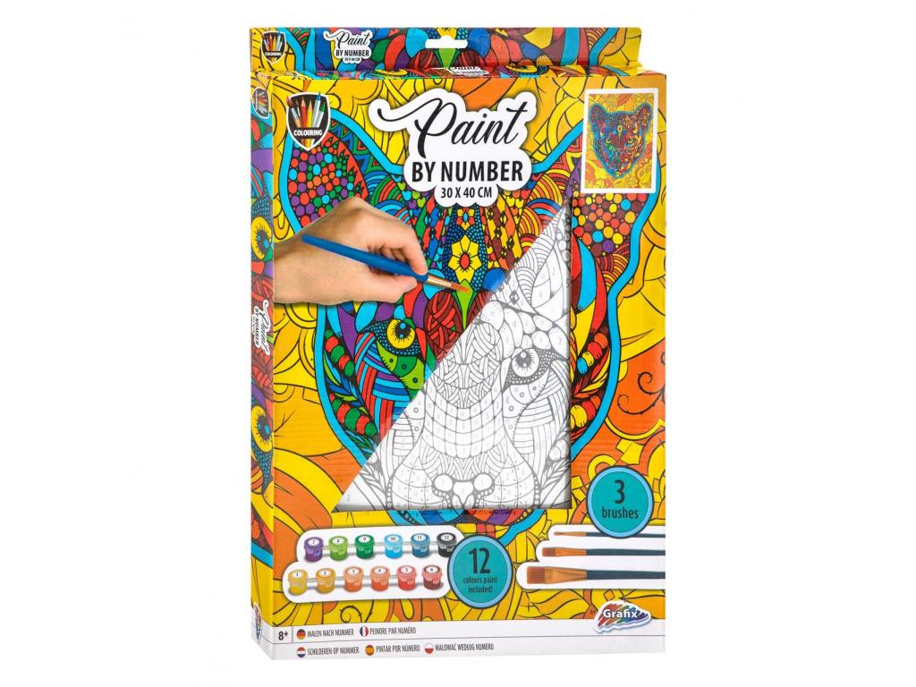 Festés számok szerint vászonra, 12 színű festékkel és 3 ecsettel. A vászon mérete 30 x 40 cm.
