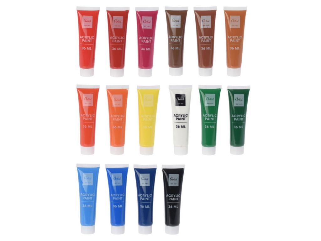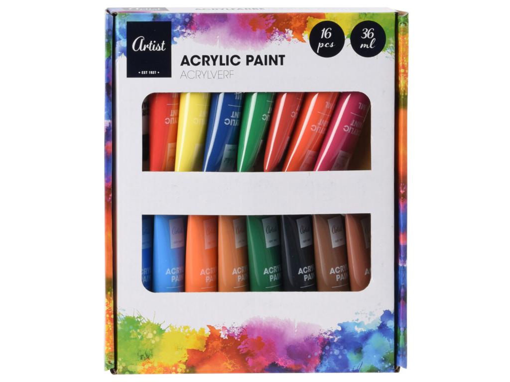 16 tubus akrilfesték, mindegyik tubus 36ml. 16 különböző szín.