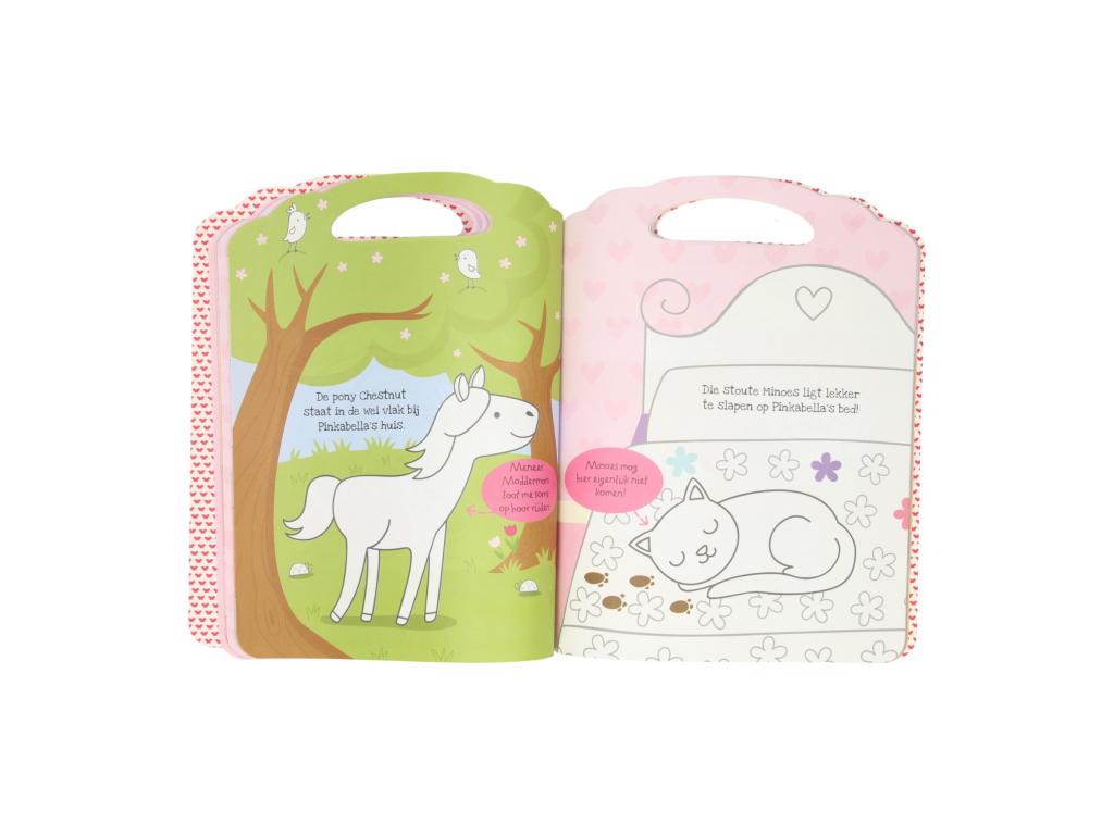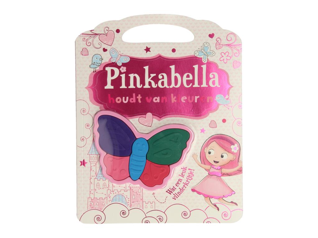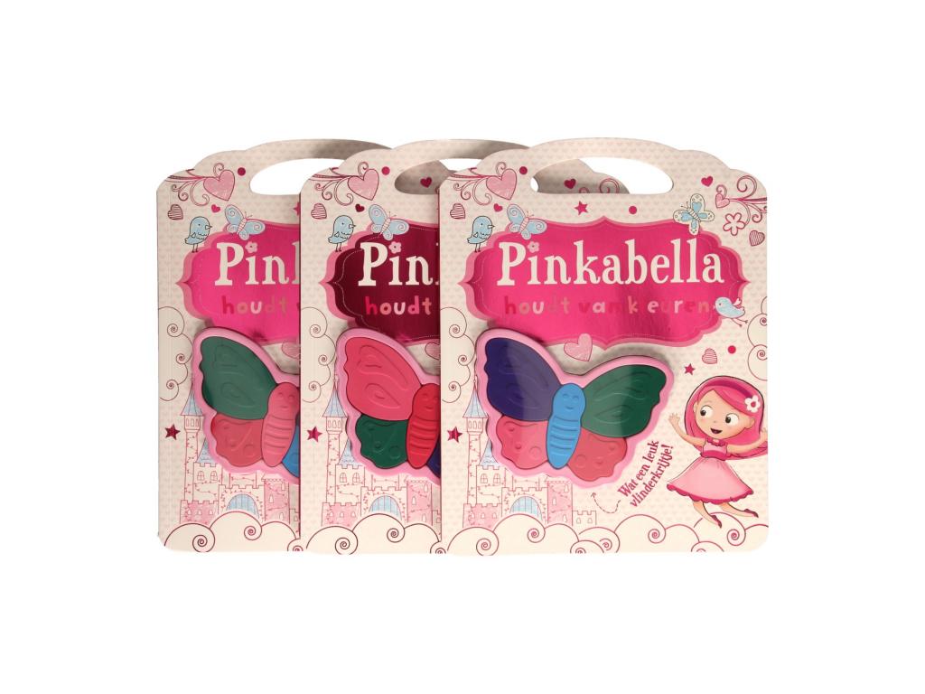 Pinkabella színezőkönyv színező oldalakkal és egy pillangó alakú, 5 színű zsírkrétával. Alkalmas 3 éves kortól.