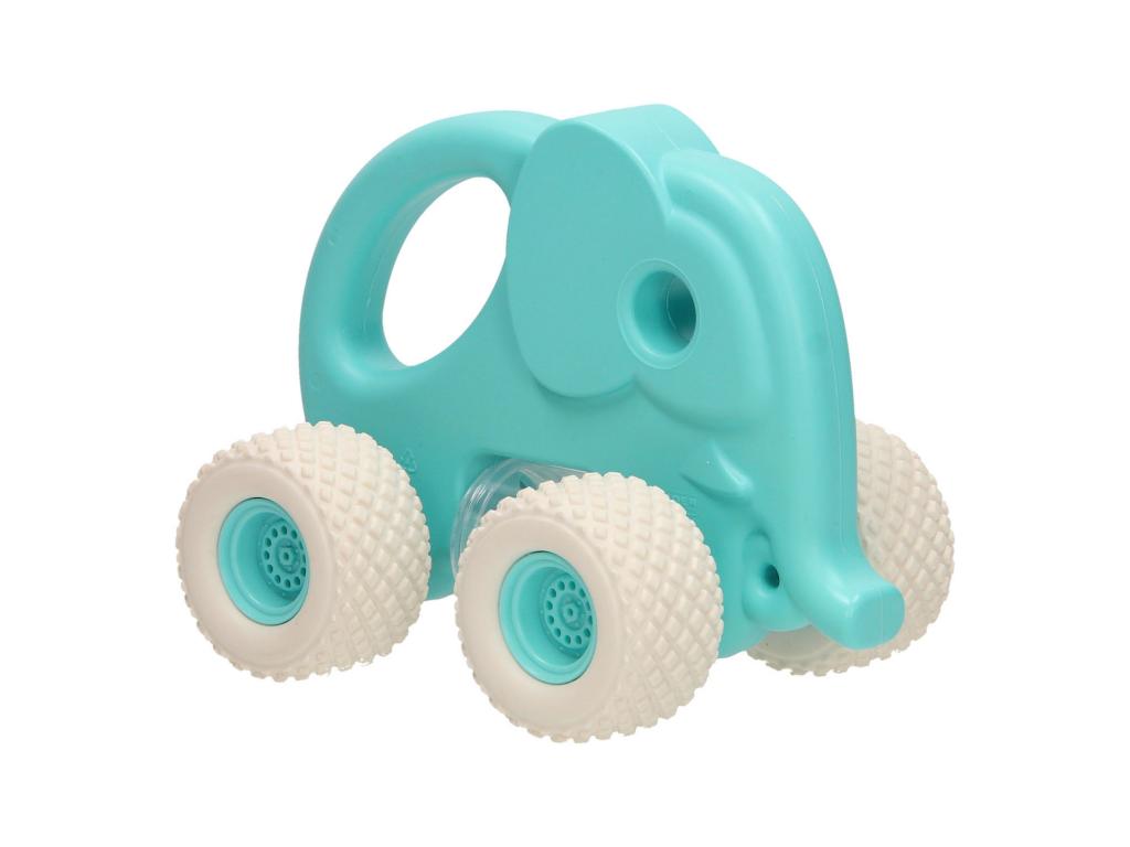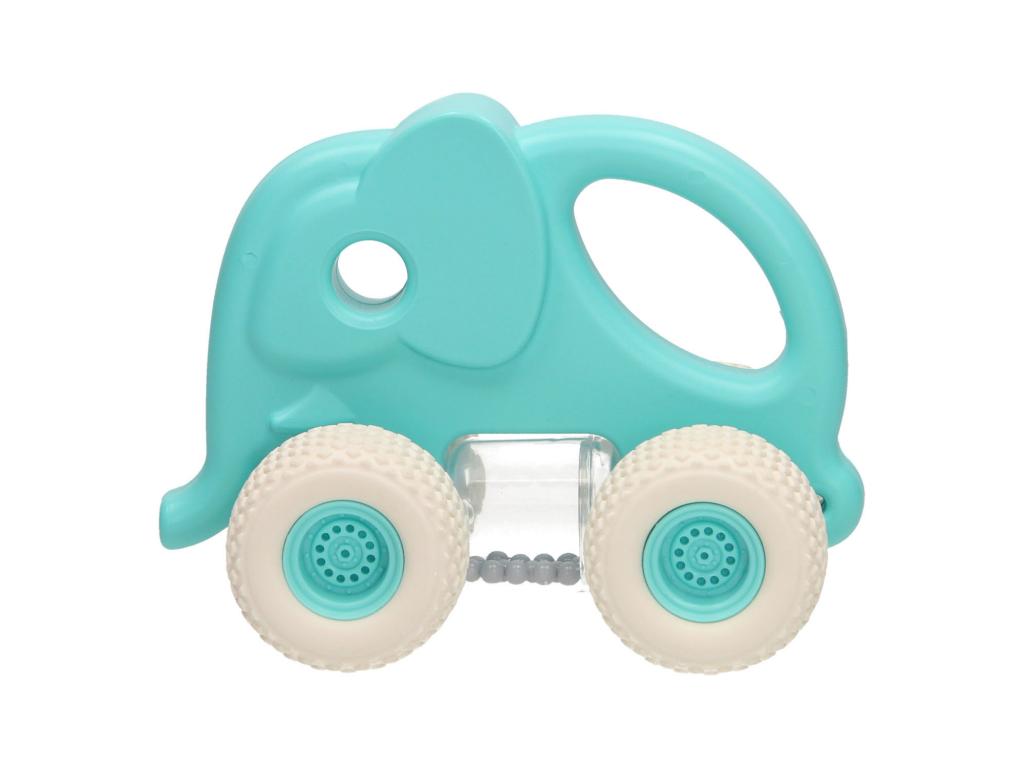 Kék elefánt racsnival és szilikon kerekekkel. Méret: 19 x 14 x 12 cm