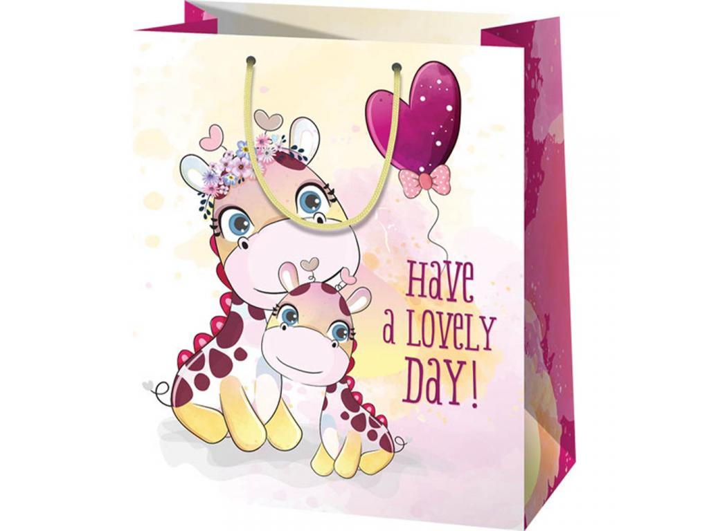 Tedd az ajándékodat ebbe az elbűvölő közepes méretű ajándéktáskába, és garantáltan mosolyt csalsz az ajándékozott arcára! A "Have a lovely day" felirat pozitív üzenetet közvetít, ami kiválóan illik bármilyen örömünnepi alkalomhoz, de akár egy normális napot is szebbé tehetsz ezzel az ajándéktáskával. A táska cuki állatos díszítéssel van ellátva, amely minden korosztály számára vonzó lehet. A kiválóan megtervezett állatfigurák egyesítik a stílust és a vidámságot, ami az ajándékadás pillanatát még különlegesebbé teszi. Az erős szalag fülek biztosítják, hogy a táska könnyen hordozható és strapabíró legyen, még akkor is, ha az ajándék kicsit nehezebb. Az erősített talprész gondoskodik arról, hogy a táska tartós és megbízható legyen, így nem kell aggódnod, hogy elszakad vagy összeesik.