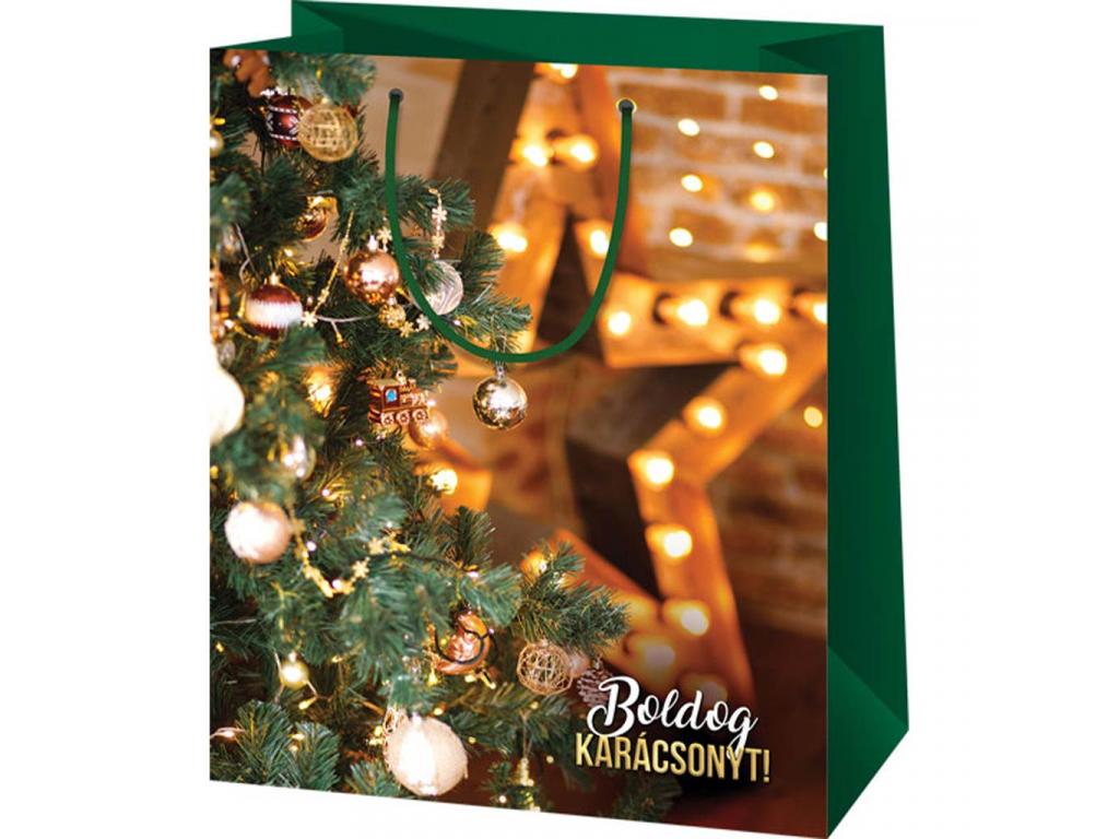 Boldog Karácsonyt díszített karácsonyfa mintás közepes ajándéktáska 18x10x23cm