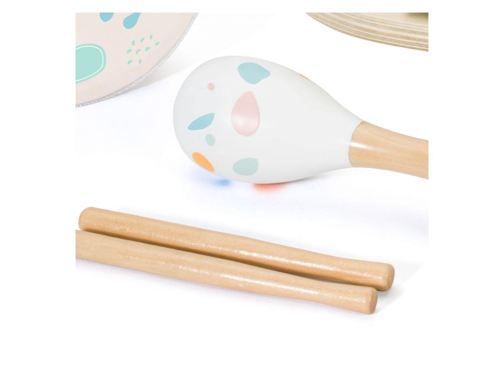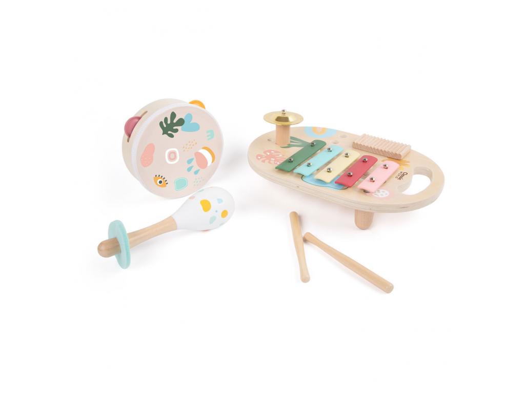 5 részes fa hangszer készlet. Tartalmaz egy xilofont,egy csörgődobot,egy rumbatököt és 1 pár ritmusbot.