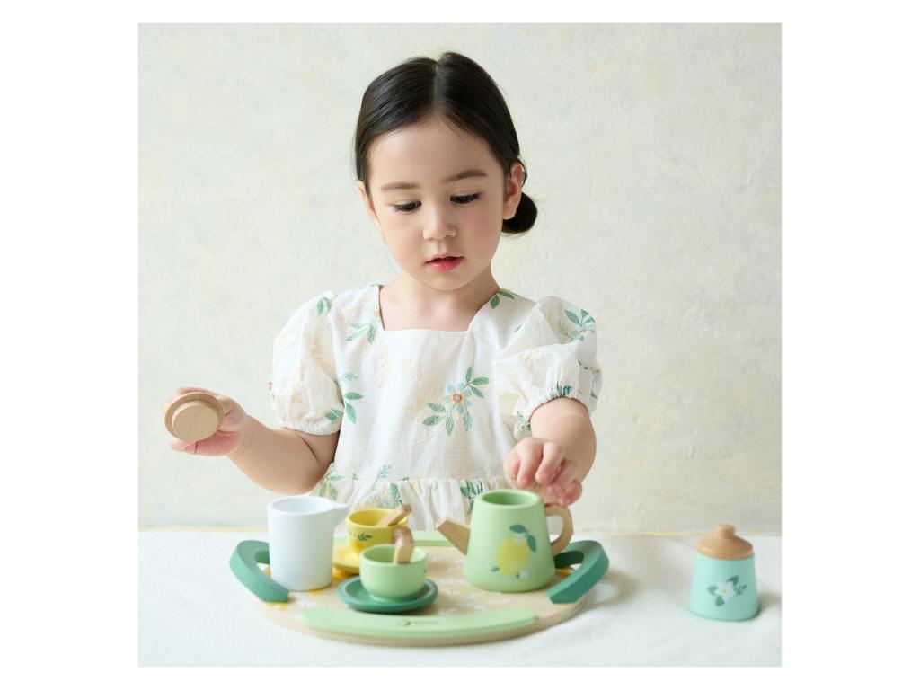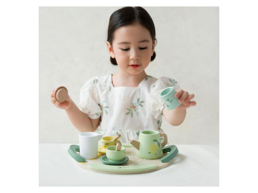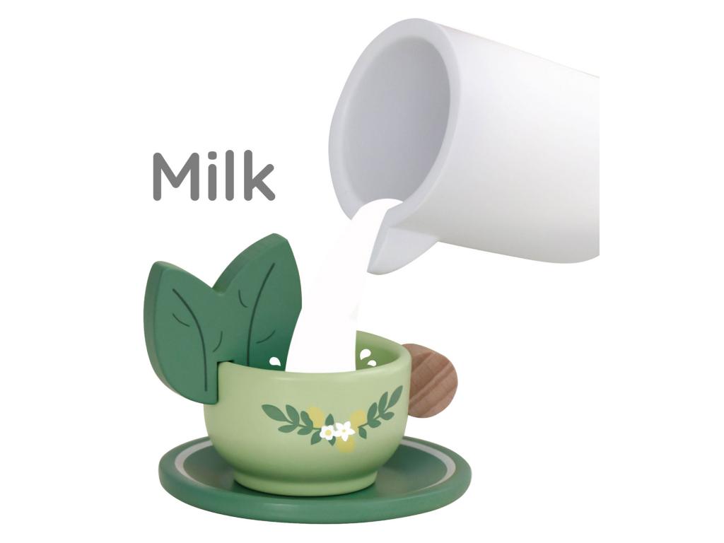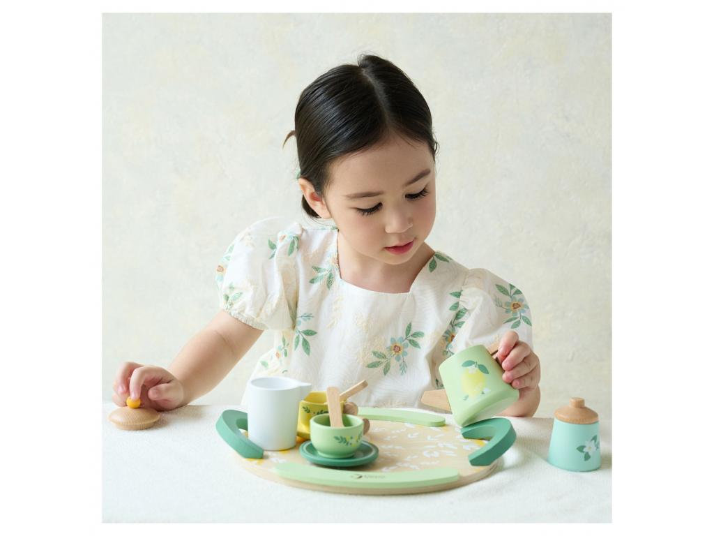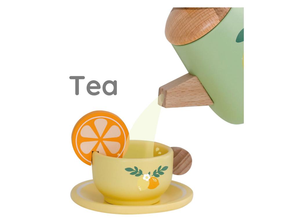 Fa teáskészlet. Tartalma: tálca,2 csészealj,2 csésze,2 kanál, 1 kancsó,1 tejkiöntő és egy cukortartó.