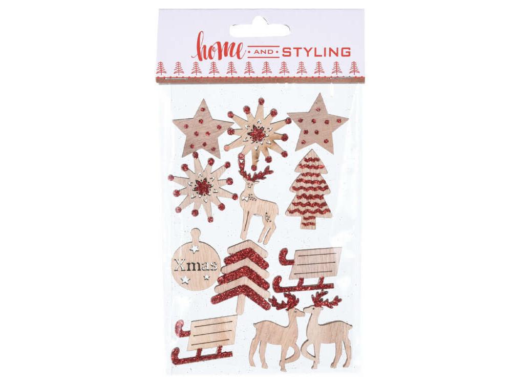Karácsonyi dekorációs figura natúr színű öntapadós díszek piros csillámporos díszítéssel