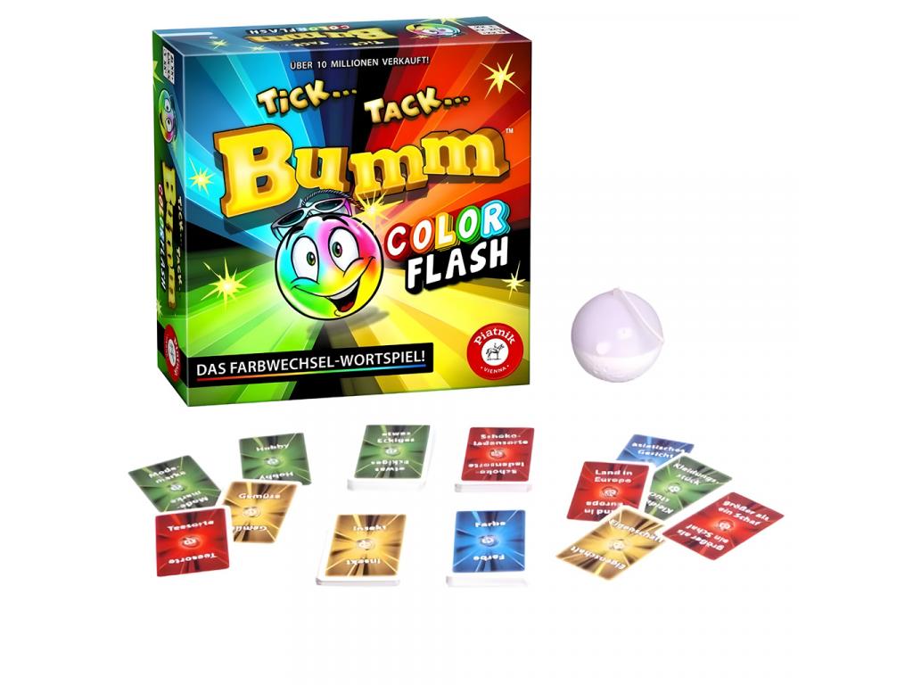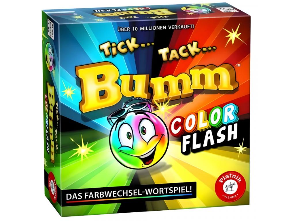 A Tick Tack Bumm Color Flash társasjáték a hagyományos Tick Tack Bumm társas egy fejlettebb, dinamikusabb változata. Ebben a játékban a bomba nem csupán ketyeg, hanem különböző színekben is világít. A szín határozza meg, hogy a játékosoknak milyen témakörben kell szavakat mondaniuk. Az alapelve azonban változatlan: az legyen Ön a leghamarabb, aki az adott témakörben a kártya szótagjával összefüggő szót kimondja, és átadja a bombát, mielőtt az felrobban.