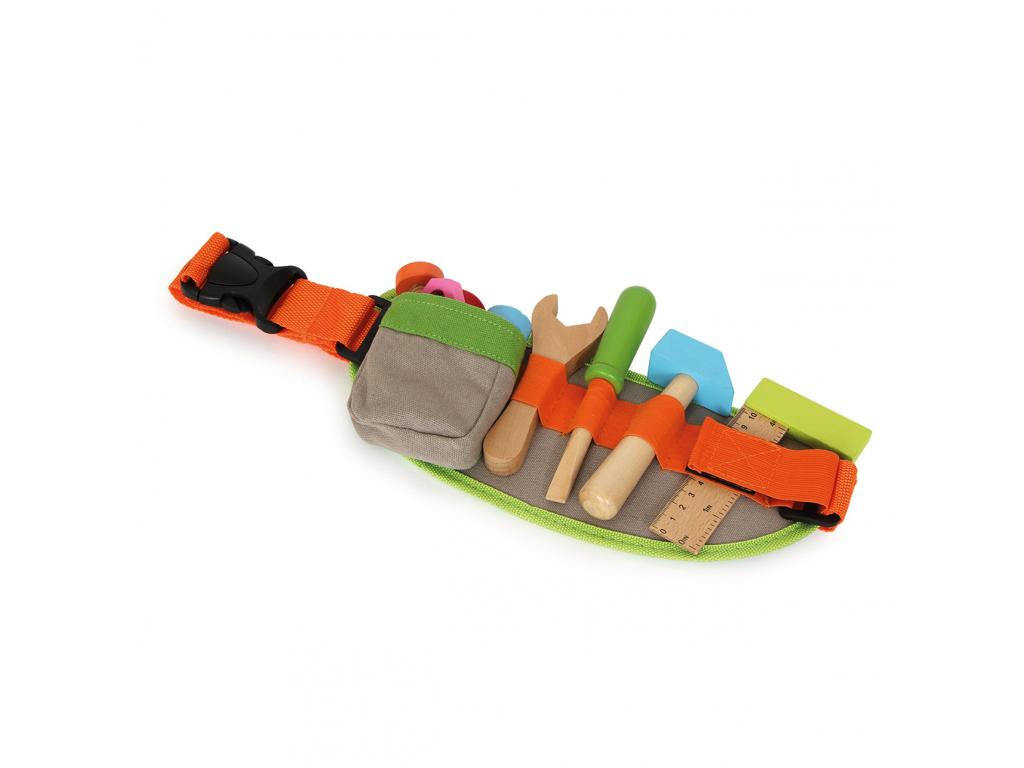 Tökéletes a kis ezermestereknek! Ennek az övnek köszönhetően mindig kéznél van minden fontos szerszám. Minden benne van, amire egy ácsnak szüksége van: vonalzó, csavarhúzó, kalapács, villáskulcs, három csavar és öt anya. Mindezek az alkatrészek fából készültek. A nejlonöv könnyen kattan, ezért kisgyerekek számára is tökéletes.