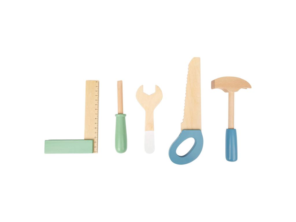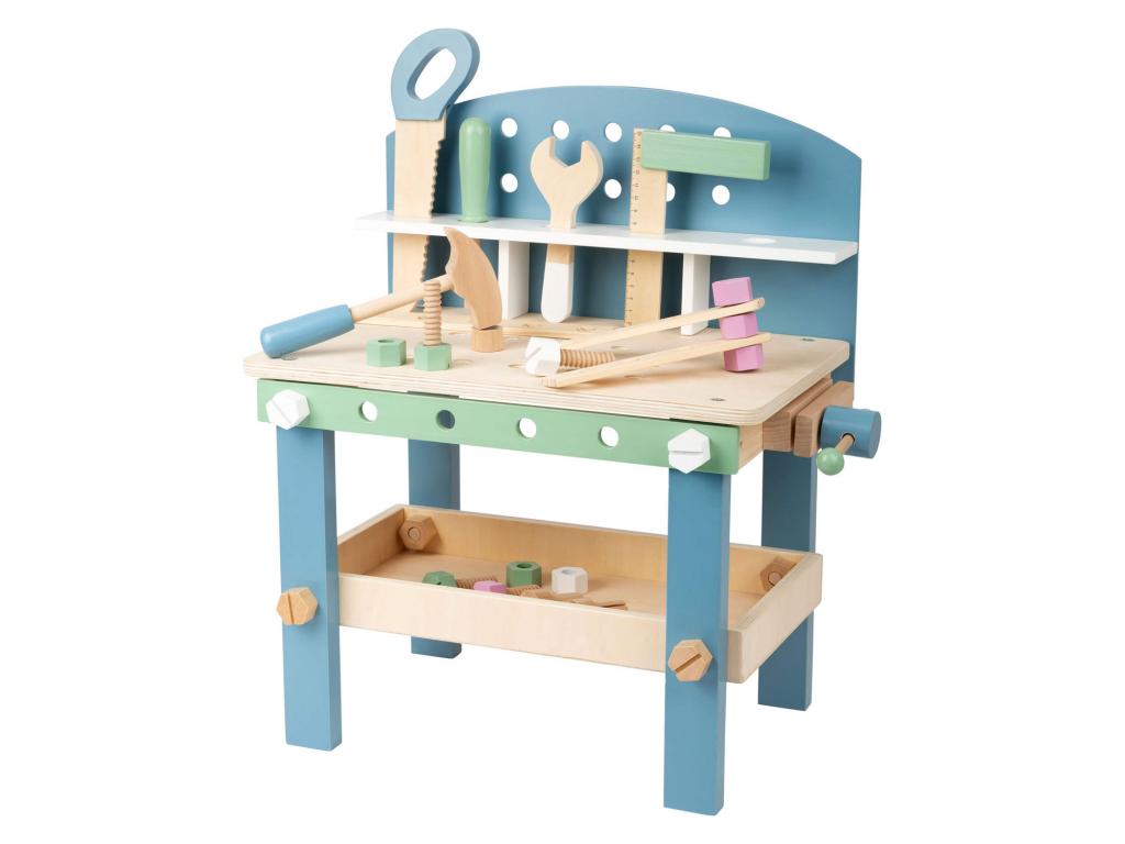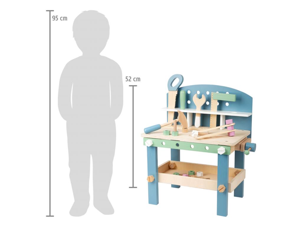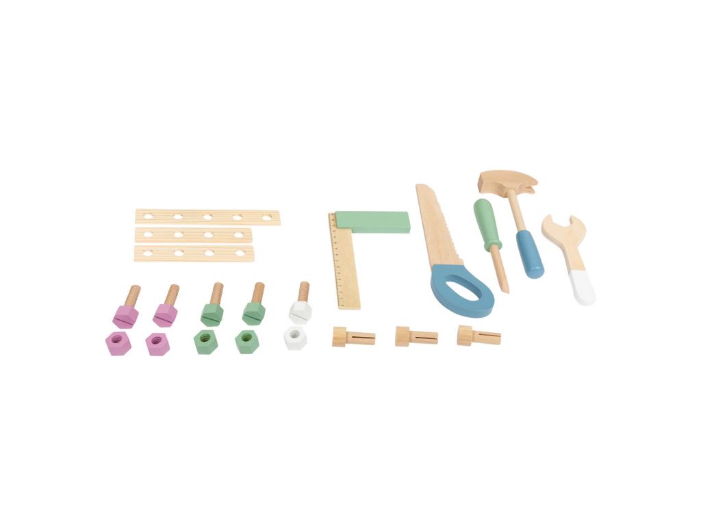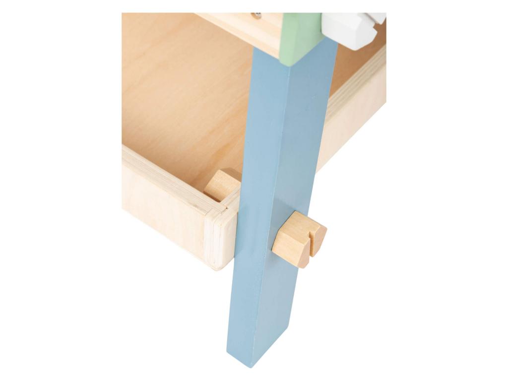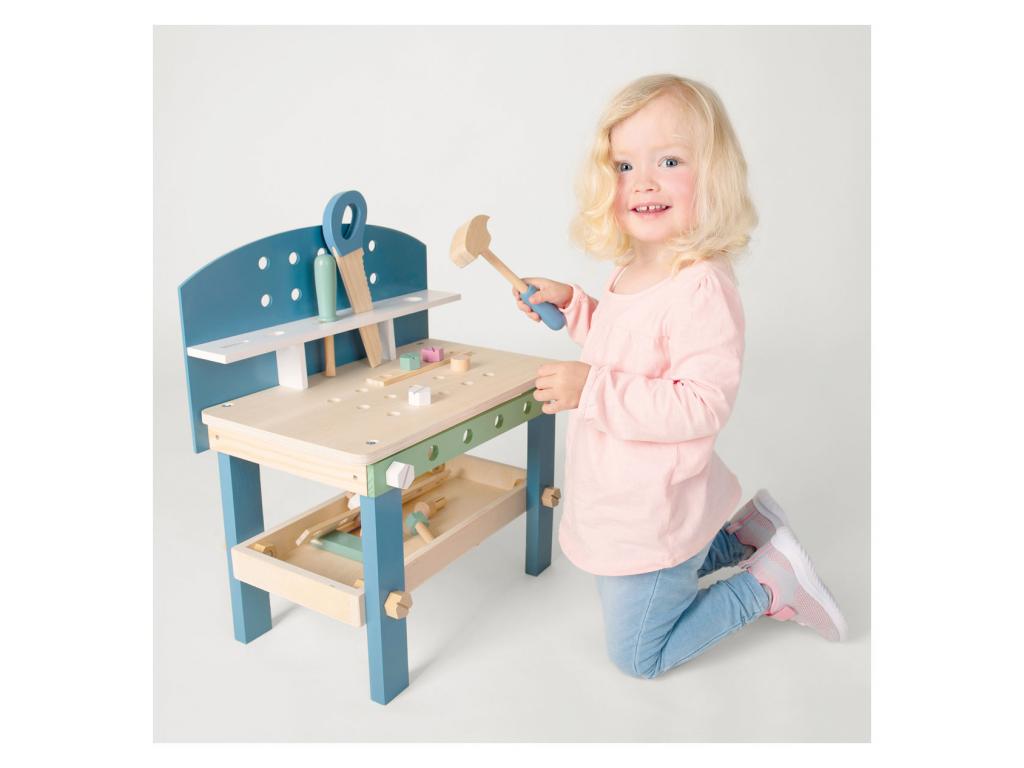 Kompakt barkácsmunka skandináv stílusban! Ezzel a fából készült munkapaddal a gyerekek kézműves készségei próbára tehetőek. Az esztergálás, fűrészelés és csavarozás gyakorlásával a finommotorikus készségeiket is edzik. A lágy színek, a letisztult formák és az egyszerű skandináv dizájn egyaránt tetszik a lányoknak és a fiúknak. 21 tartozékot tartalmaz. A tartozékok 5 csavarból, 5 anyából, 3 szögből, 3 lyukasztócsíkból és 5 szerszámból állnak. Itt már a kis kézművesek is segíthetnek az összeszerelésben és élvezhetik az eredményt. A szerszámok és kiegészítők helytakarékosan tárolhatók és mindig kéznél vannak. Kompakt szerepjáték a gyerekszobába! Az egyszerű kialakításnak köszönhetően bármilyen enteriőrbe illeszkedik.