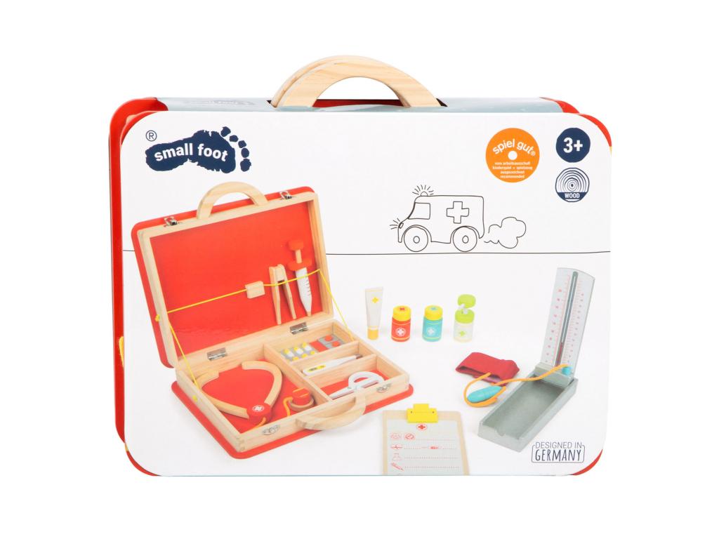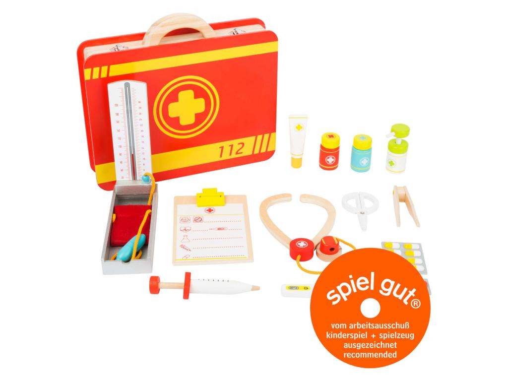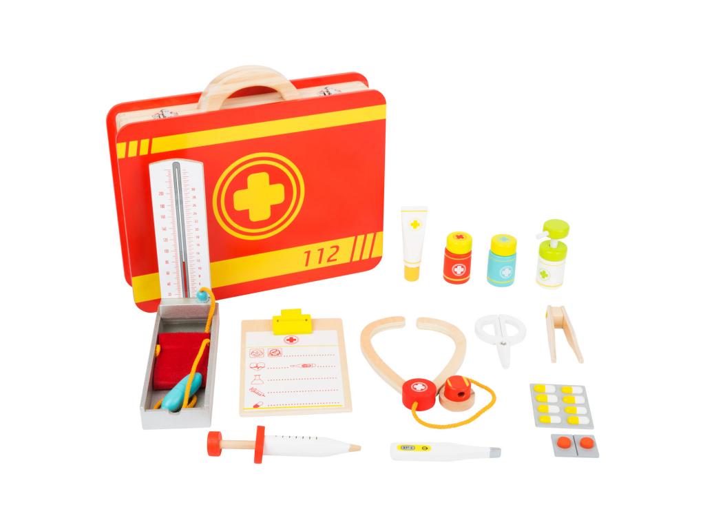 Divatos orvosi készlet egy tokban fiatal orvosok számára. Minden elképzelhető orvosi vészhelyzet a gyerekszobában kezelhető ezzel a fából készült orvosi táskával. A számos használati eszköz minden orvos kívánságát teljesíti. A fecskendők és kenőcsök még pumpafunkcióval is rendelkeznek. Így például minden babának és mackónak meg lehet mérni a vérnyomását, és az előírt módon el lehet látni a sebeit. Végül minden kezelés rögzíthető az orvosi gyakorlati dossziéban. Értelmes játék a szociális kompetenciák gyakorlására és kipróbálására szerepjátékban. A következő beteget kérem!