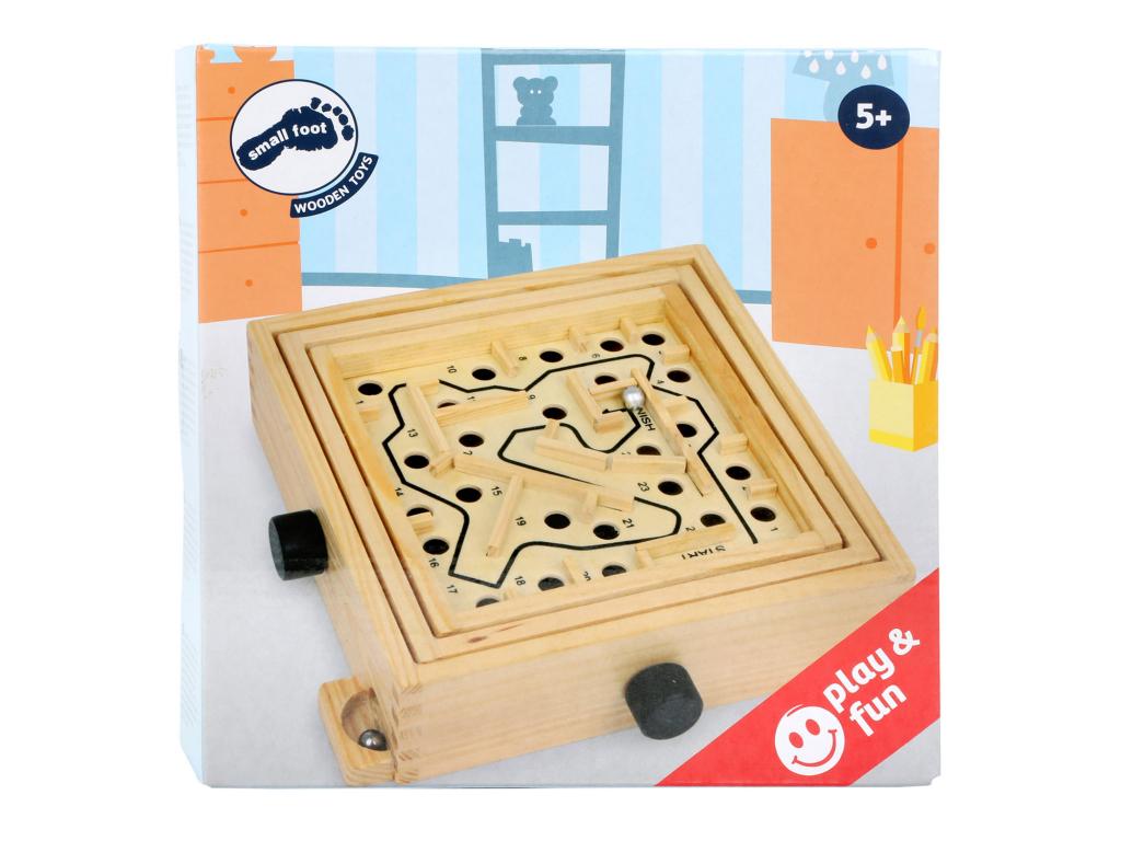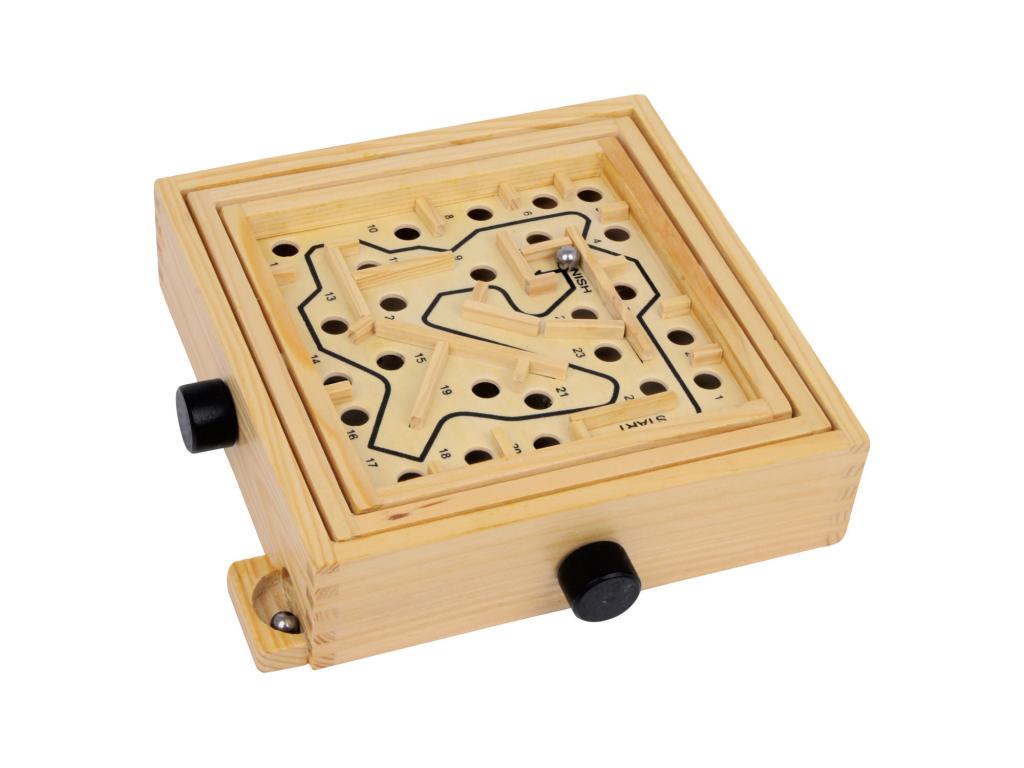 Ez a fából készült labirintus erős idegeket és biztos kezeket igényel! Az oldalsó kezelőszervek segítségével döntsd és döntsd a falapot, hogy a labdát biztonságosan a célba juttasd. De vigyázz: a sok lyuk megnehezíti a középre vezető utat! Kinek van annyi ügyessége, hogy a golyót a végső célba juttassa? Ez egy remek ügyességi játék minden türelmes embernek, fiatalnak és idősebbnek egyaránt! Méret: 22 x 21 x 5,5 cm