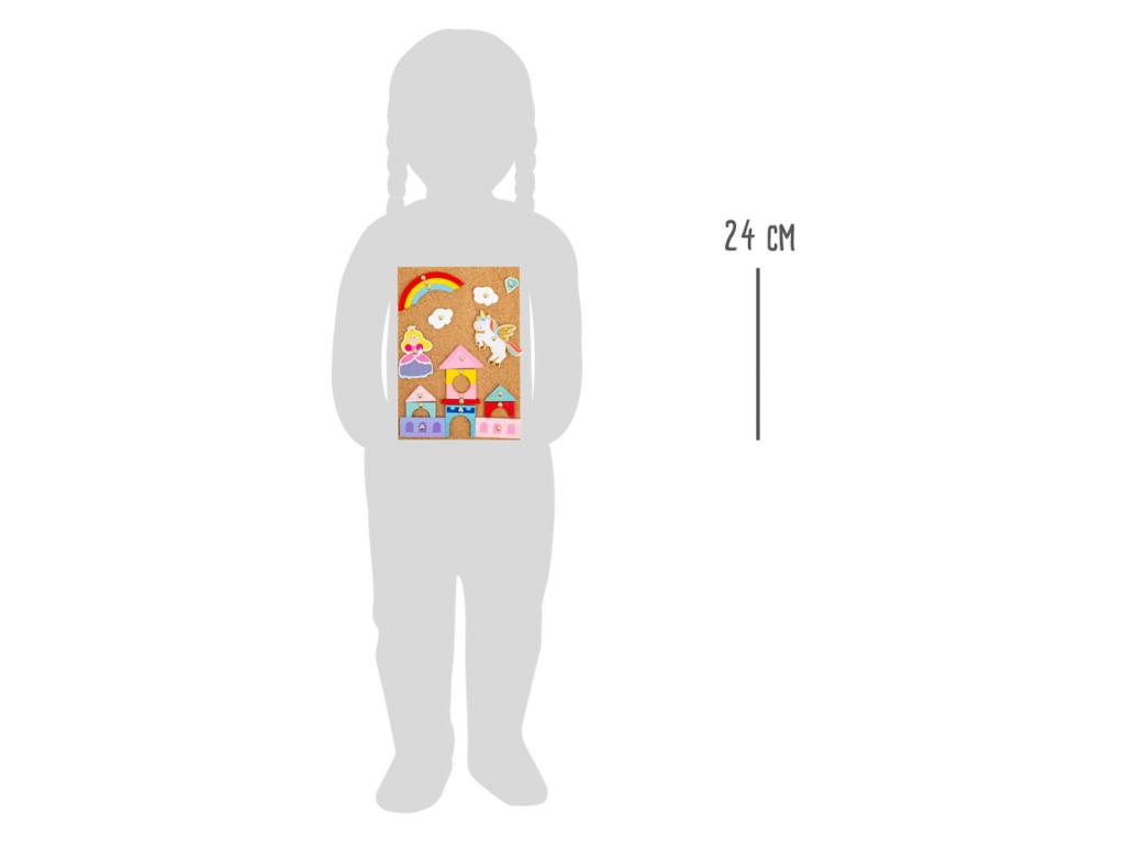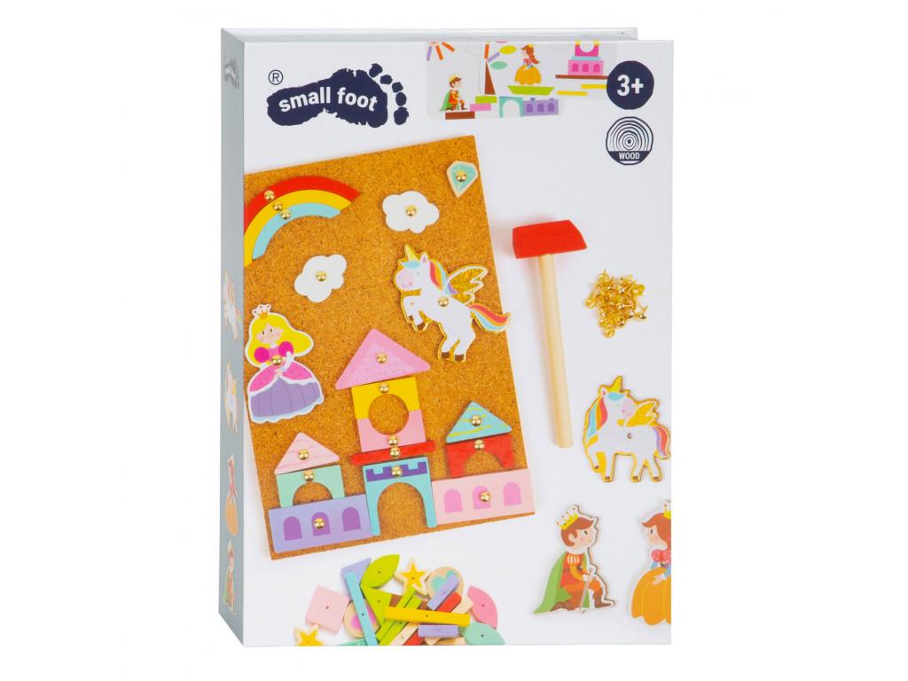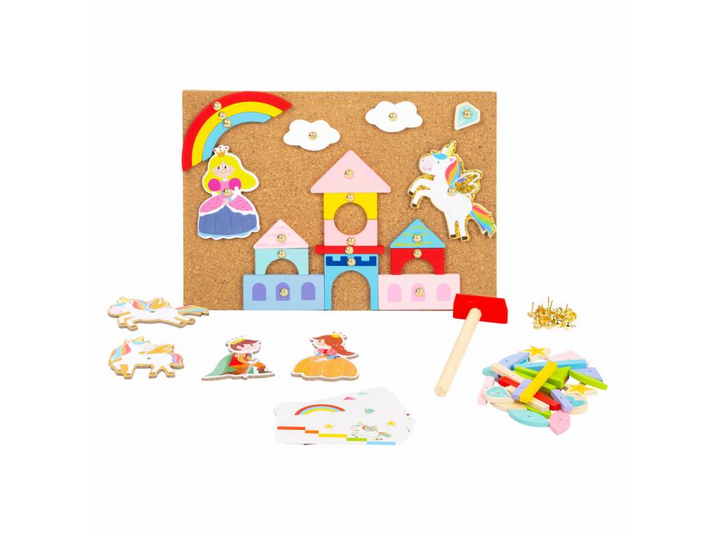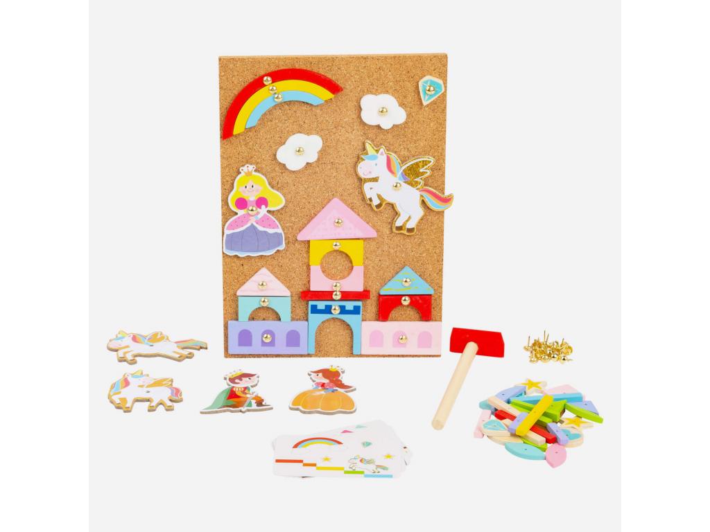 Varázslatos kézműves móka kalapáccsal és szögekkel! Egy parafa táblával, két kis kalapáccsal, 100 kis szöggel és 126 színes fadarabbal felszerelve készen állsz arra, hogy elkészítsd a saját egyedi képedet. 6 fotósablonnal és tárolódobozzal! Legyen szó hercegnőről, mesebeli kastélyról vagy egyszarvúról, ez a készlet mindent tartalmaz, ami egy varázslatos fotó elkészítéséhez szükséges. Ha elsőre ötletekre van szükséged, csak ragadd meg a nyolc képsablon egyikét és máris kezdheted! Ez az ügyességi játék elősegíti a kreativitás fejlődését és teret ad a gyerekeknek saját alkotásaik, képeik létrehozásához. És mivel praktikus dobozba van csomagolva, semmi sem fog hiányozni!