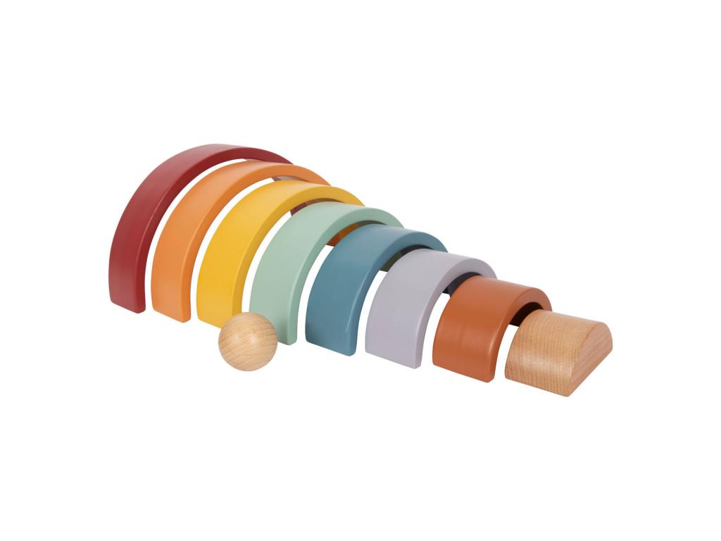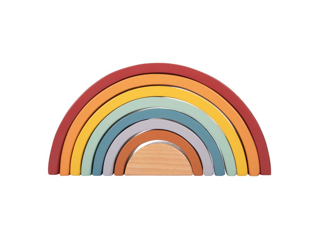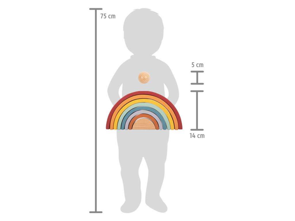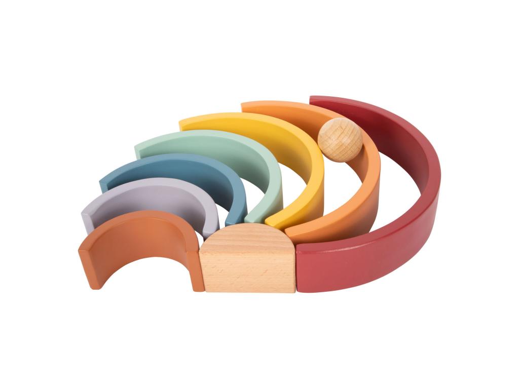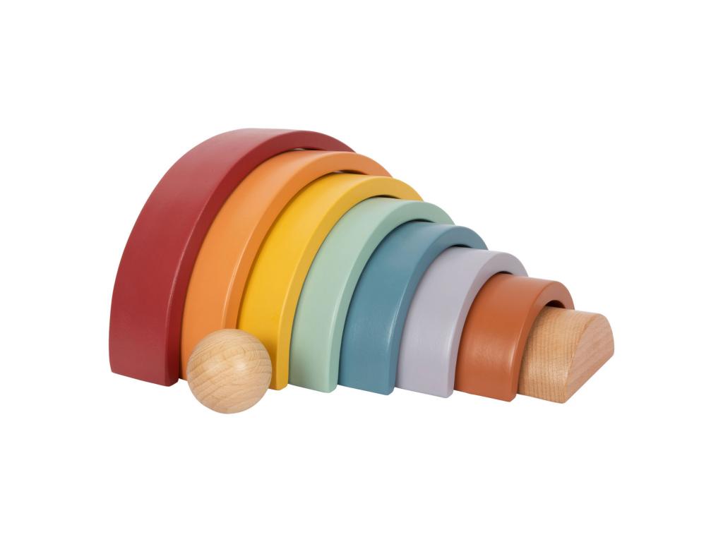 Ez a természetes fából készült labdával kísért robusztus fa szivárvány ideális játszótárs a kisgyermekek számára. A trendi szivárványszínekben pompázó 8 fa ív sokféleképpen használható, például válogatásra, építésre vagy egymásra rakásra, és minden korosztályt lenyűgöz természetes tapintásával és különösen szép megjelenésével. Fenntartható fából készült, és 12 hónapos kortól alkalmas gyermekek számára. Méret: 26 x 14 x 5 cm, golyó O 5 cm