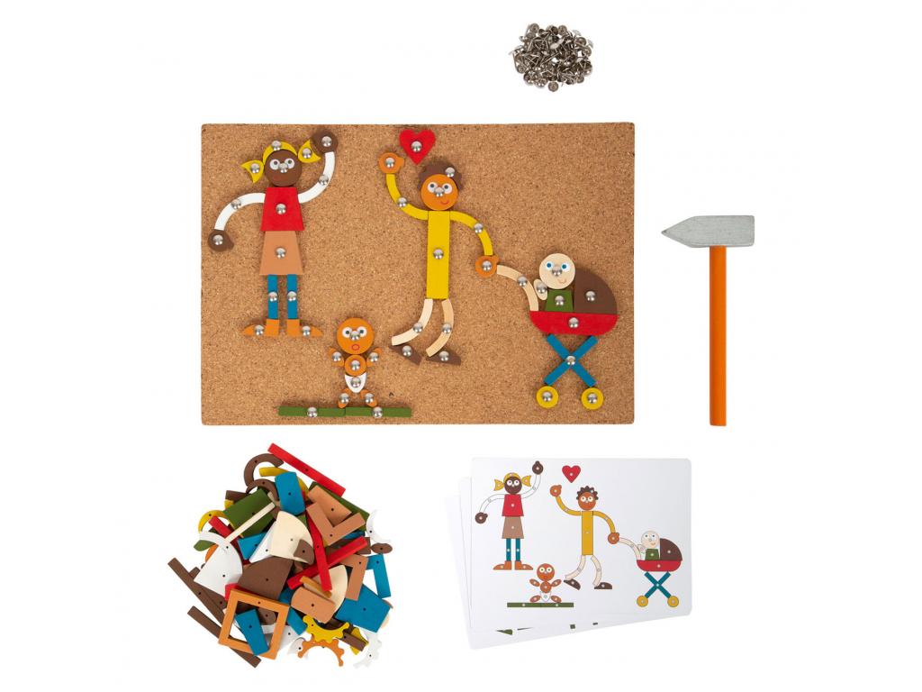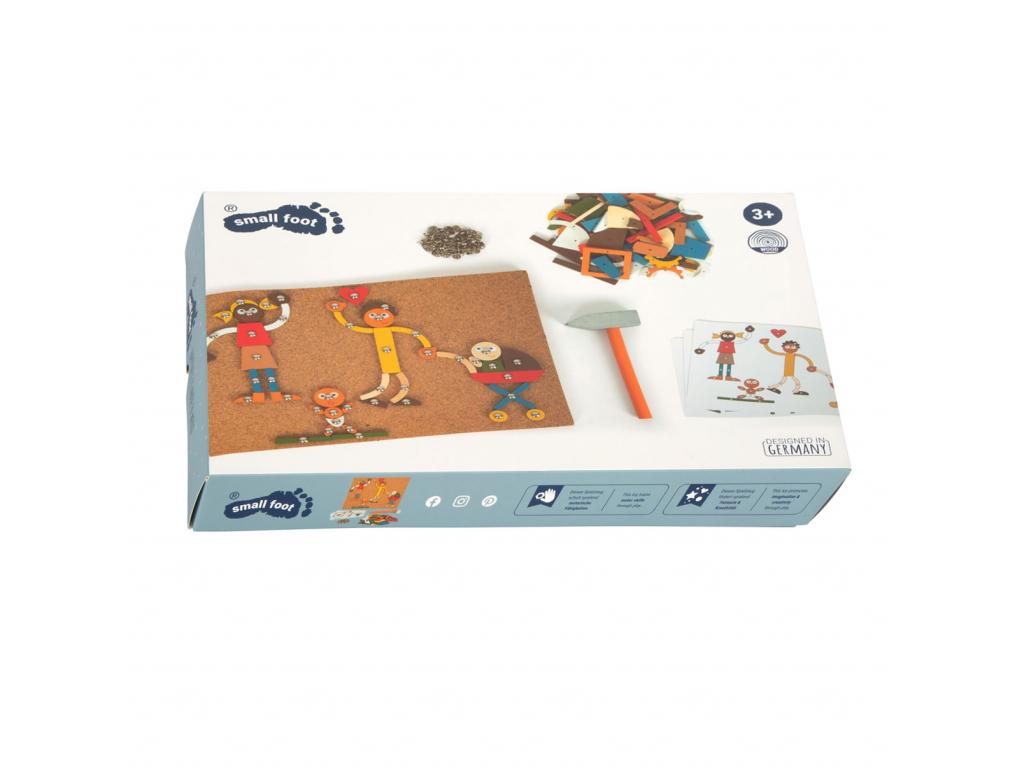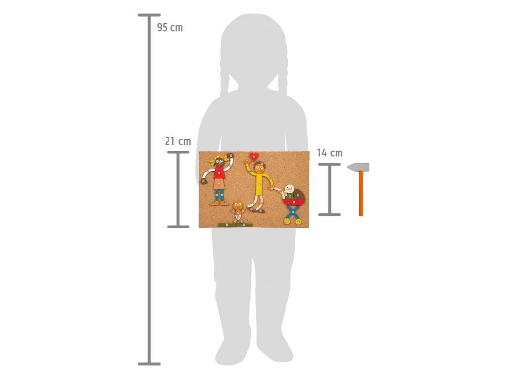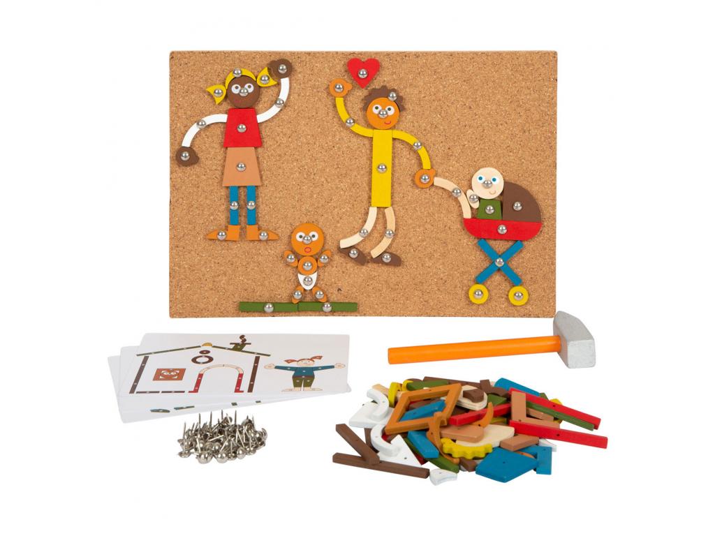Kiterjedt kreatív játékkészlet a család témakörében! A parafa táblával, fakalapáccsal, szögekkel és sok különböző laminált fából készült faelemmel kiegészített kalapácsos játékkal számtalan képet és motívumot készíthetsz a család témakörében, például a szülőkről, testvérekről, barátokról vagy háziállatokról. Tartalmaz 6 fotósablont és egy tárolódobozt! Klasszikus kalapácsjáték modern színekben, amely lehetővé teszi, hogy kreatívan alkosson mindenféle embert a családjából vagy baráti köréből, olyan témákat ábrázolva, mint az érzelmek vagy a sokszínűség. Ezzel a játékkal lehetőséged van saját alkotásodat elkészíteni, vagy követheted a képsablonokat. A saját képek készítése elősegíti a kreativitás fejlődését. A gyerekek emellett a kézügyességüket is edzik, jobban megismerik a színeket és a formákat, fejlesztik vizuális érzékelésüket ezzel a kalapácsos játékkal. És még egy előny: a kalapácsjátékok különböző korosztályok számára alkalmasak, és hosszan tartó szórakozást nyújtanak.