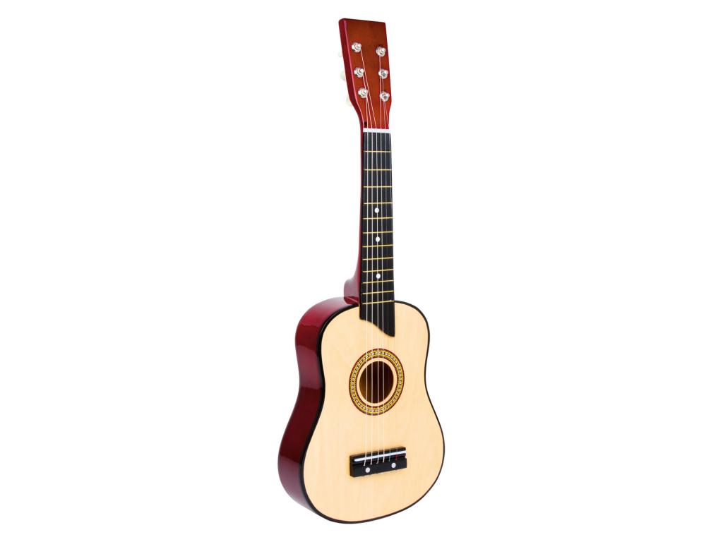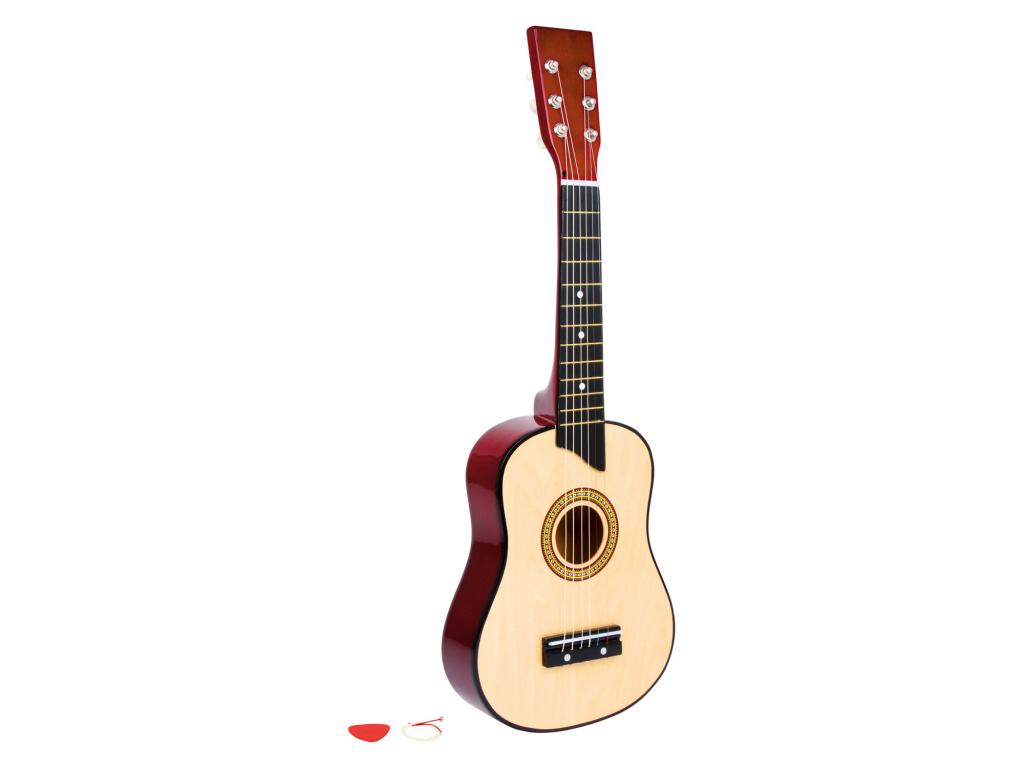 A hangok világát felfedezheted ezzel a klasszikus akusztikus gitárral. A hat meghúzható nejlonhúr és a pengető szinte igazi "felnőtt" hangszerré teszi ezt a játékot. A gyermekbarát fa gitárnyaknak köszönhetően még a legkisebb zenészek is jól meg tudják fogni a húrokat, így az első dallamok elkészítése gyerekjáték lesz. Ez a gitár a tökéletes hangszer a jövő rocksztárjai számára!