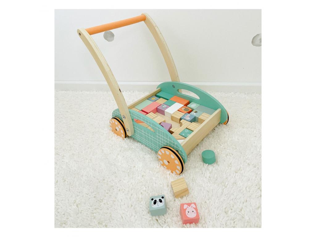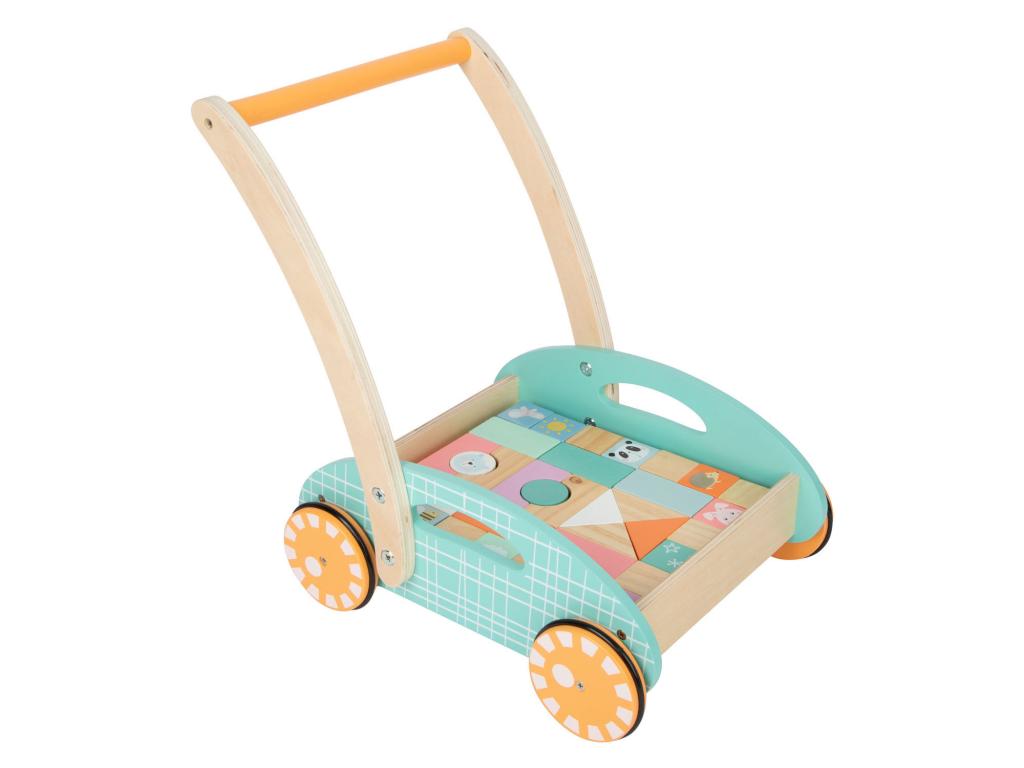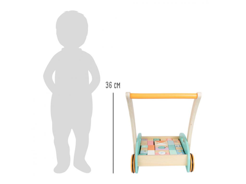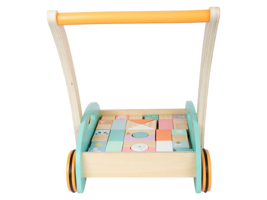 Ez a népszerű pasztellszínekben pompázó járássegítő támogatja a gyermekeket az első járási kísérleteikben. A 34 építőkocka, amelyek részben természetes módon kezeltek, részben lágy pasztellszínekkel festettek és vidám állatokkal díszítettek, dupla szórakozást ígérnek, és elősegítik a formafelfogás, a motorikus készségek és a kreativitás fejlődését a fiatal építőmestereknél. A gumírozott kerekek védik a padlót és csendes gurulási örömöt nyújtanak. Beépített tengellyel! Méret: 36 x 34 x 27 cm, toló magasság 36 cm