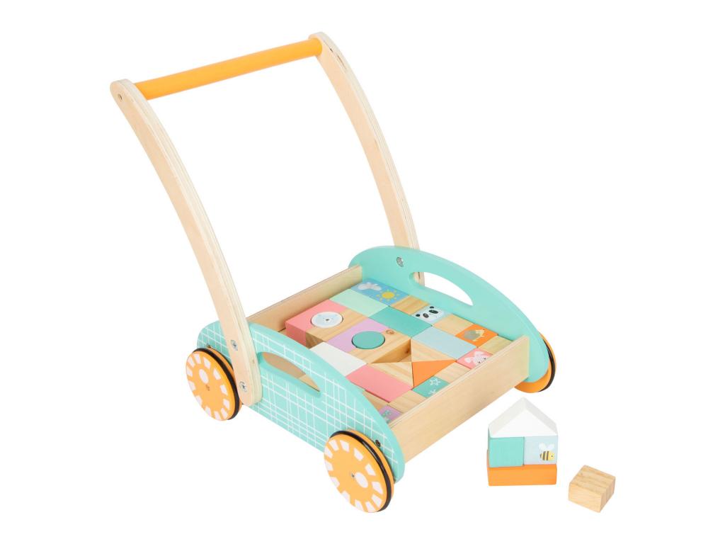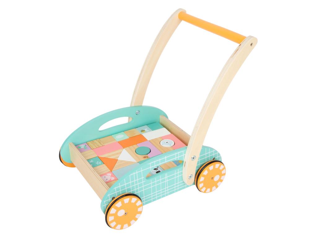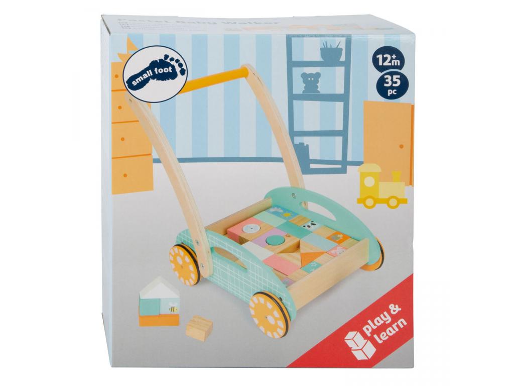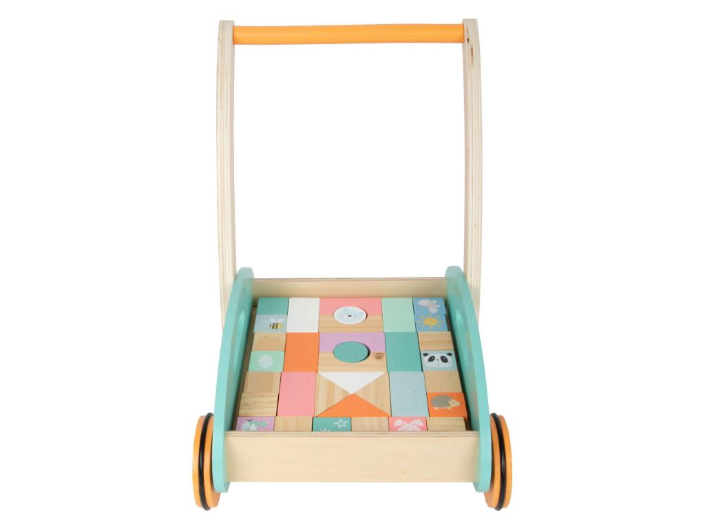 Ez a népszerű pasztellszínekben pompázó járássegítő támogatja a gyermekeket az első járási kísérleteikben. A 34 építőkocka, amelyek részben természetes módon kezeltek, részben lágy pasztellszínekkel festettek és vidám állatokkal díszítettek, dupla szórakozást ígérnek, és elősegítik a formafelfogás, a motorikus készségek és a kreativitás fejlődését a fiatal építőmestereknél. A gumírozott kerekek védik a padlót és csendes gurulási örömöt nyújtanak. Beépített tengellyel! Méret: 36 x 34 x 27 cm, toló magasság 36 cm