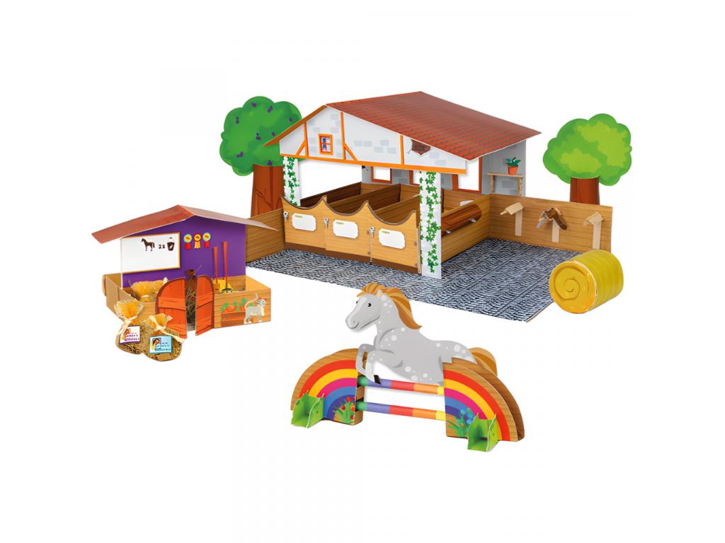 Ha ezek mind megvannak, már kezdődhet is a móka és a ragasztgatás, amit a szettben lévő útmutatóval tud majd gyermeked lépésről lépésre megtenni, a végén pedig már kész is a lovarda, kezdődhet is a játék.
