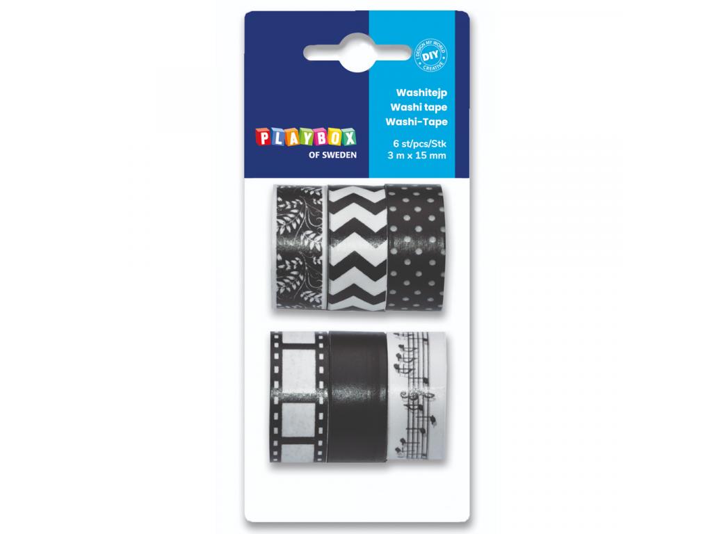 A PlayBox: Dekorációs ragasztó szalag fekete és fehér színben 6 db-os szett leírása: