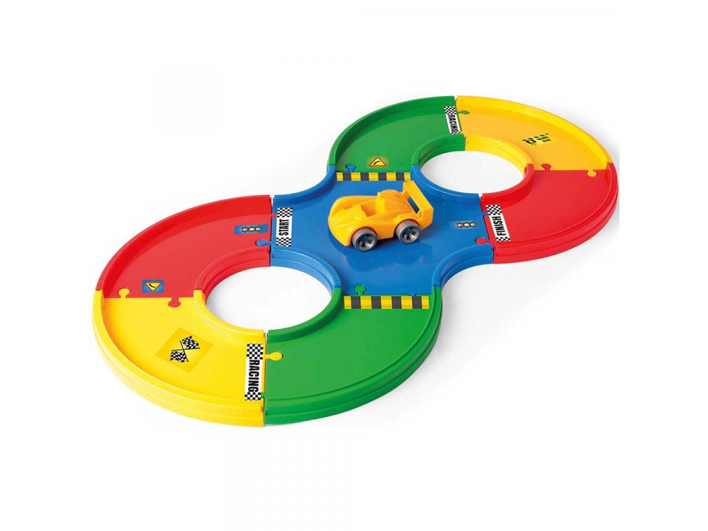 A Wader Play Tracks Alap gyorsasági pályaszett a sebesség szerelmeseinek készült! Ebben a szettben minden megtalálható, ami egy izgalmas autóversenyhez kell: 1,6 méter hosszú pálya, egy versenyautó és 36 matrica a teljes testreszabáshoz. A könnyen összeállítható pályaelemek biztosítják, hogy a kis versenyzők percek alatt készen álljanak az első nagy futamra. Az autópálya különböző színei és jelölései nem csak a szemnek nyújtanak látványt, hanem a gyerekek figyelmét is folyamatosan lekötik, miközben fejlesztik a kézügyességet és a koordinációs készséget. A matricák segítségével pedig mindenki egyedi megjelenést kölcsönözhet a versenypályának és az autónak.