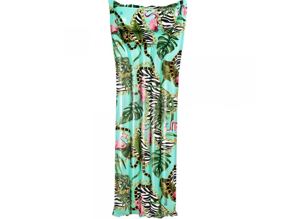 A matrac mintája lenyűgöző: világoskék alapon pálmafa levelek, zebraminták és flamingók láthatók, amelyeket egy kis arannyal vegyítettek. Ez a trópusi dizájn igazi üdítő látványt nyújt, ami tökéletesen passzol a nyár hangulatához és a vízi kalandokhoz.