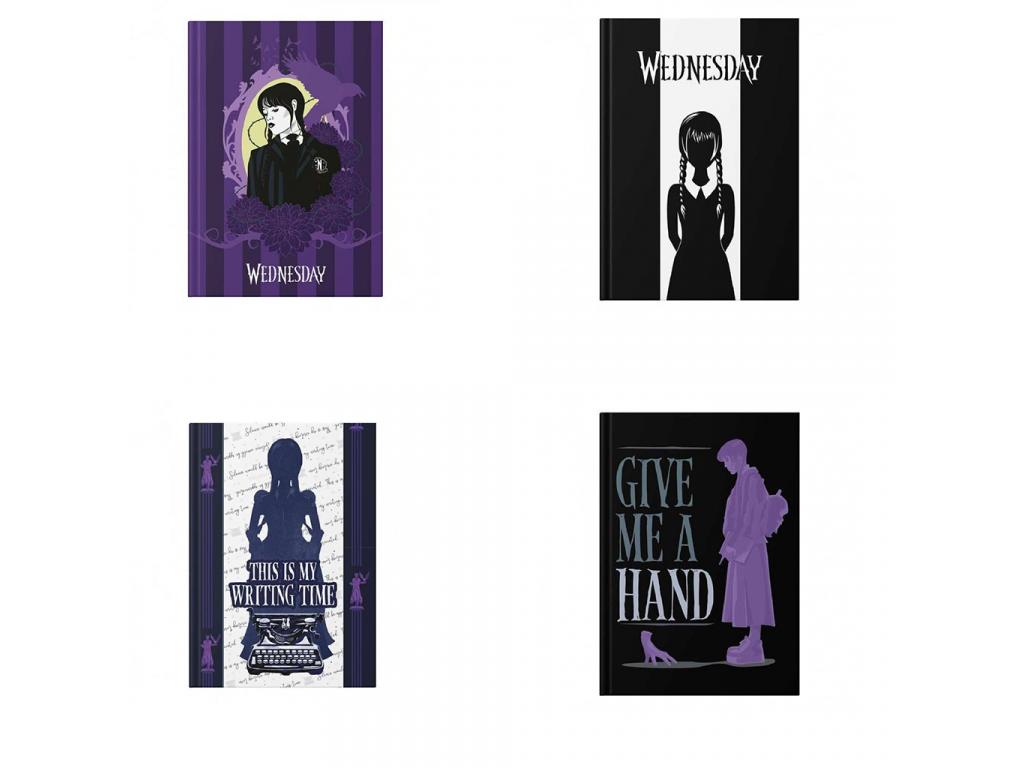 Az A5-ös méret ideális választás, mivel könnyen hordozható, és elegendő teret biztosít minden fontos feljegyzéshez, anélkül, hogy túl nagy vagy kényelmetlen lenne a napi használat során. Az egyes jegyzetfüzetek dizájnjai között megtalálható Wednesday Addams különböző megjelenései: egy lila virágmintás háttérrel körülvett karakter, egy minimalista fekete-fehér csíkos design, egy inspiráló írógépes motívum "This is My Writing Time" felirattal, valamint egy rejtélyes "Give Me a Hand" grafika.