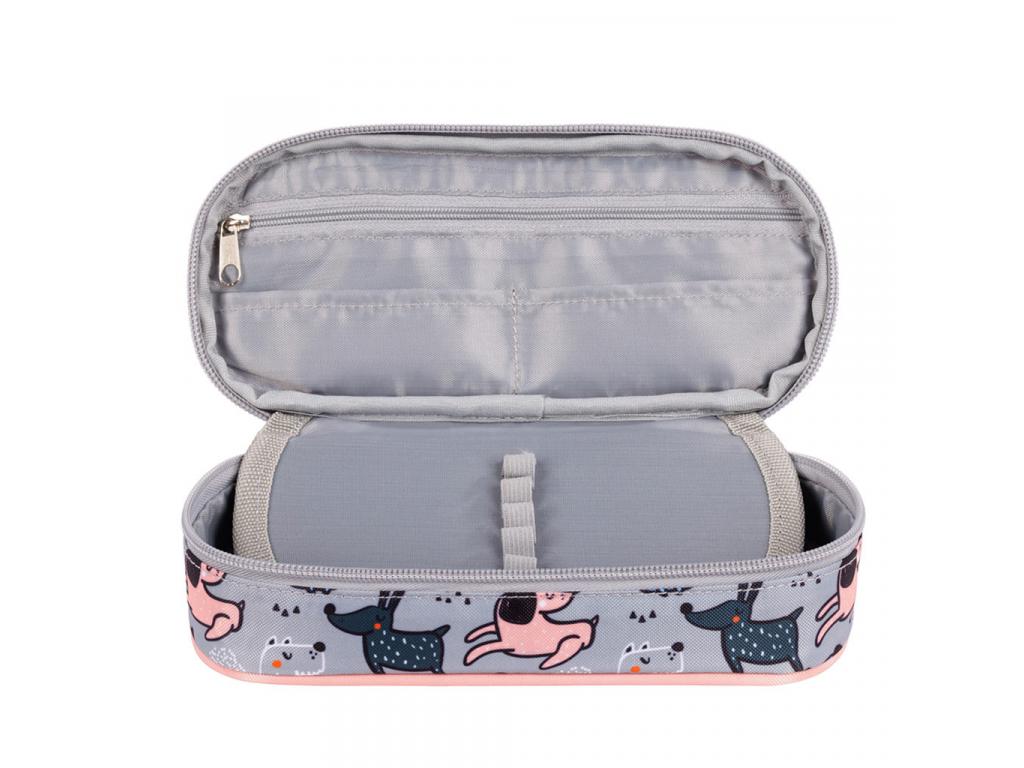 A tolltartó külső része strapabíró anyagból készült, amely biztosítja, hogy hosszú ideig megőrizze eredeti állapotát. A szürke alapszín és a vidám kutyás minta mellett a rózsaszín cipzár és a kutyatalp formájú cipzárhúzó még különlegesebbé teszi ezt a tolltartót. A kétoldali cipzáras kialakítás könnyű hozzáférést biztosít a belső tartalomhoz, és megbízhatóan zárja le a tolltartót.