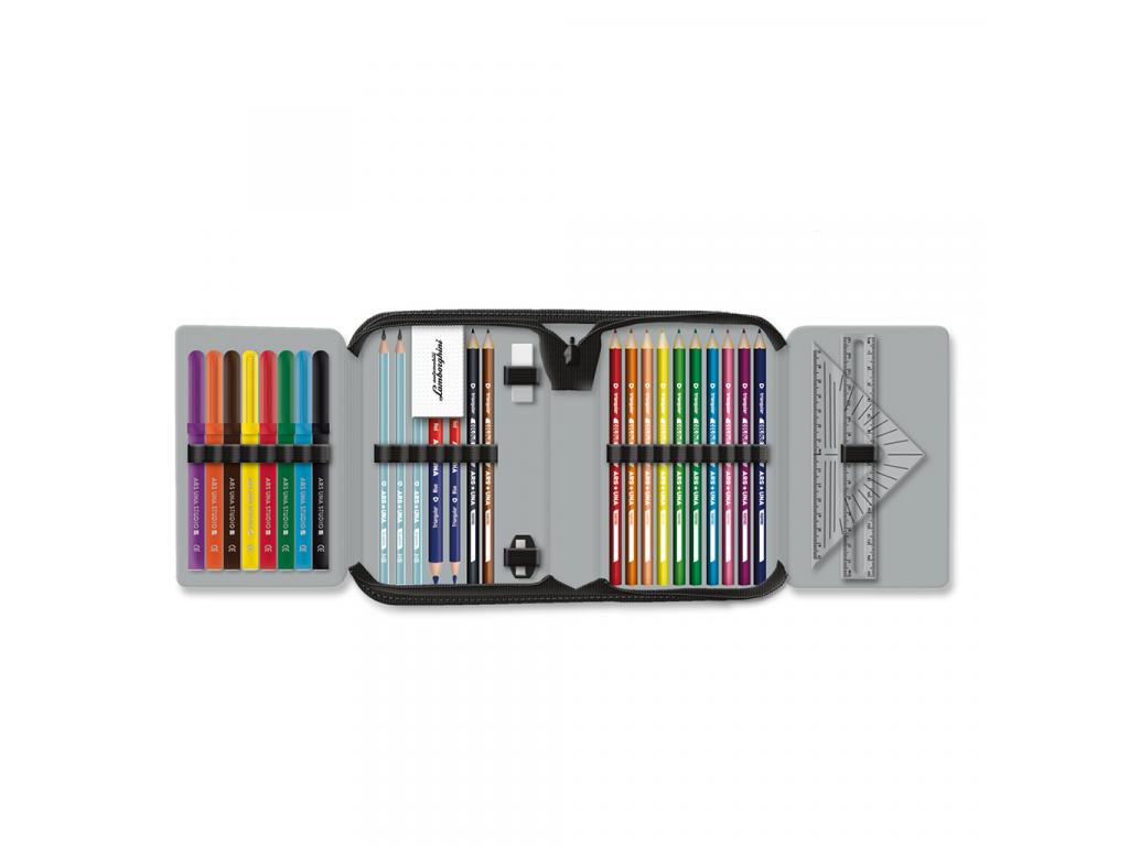 Ez a töltött tolltartó mindent magában foglal, amire egy kreatív és rendszerető gyereknek szüksége lehet az iskolában vagy otthoni tanulás során. Tartalmazza a színes ceruzákat, grafit ceruzákat, postairónokat, radírt, hegyezőt és további írószereket, hogy minden kihívásnak és feladatnak könnyedén meg tudjon felelni.