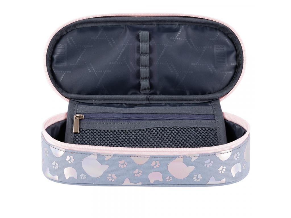 A St.Right Silver Cats cicás ovális tolltartó 23 cm-es méretben ideális választás minden kisdiák számára, aki szereti a cicákat és a stílusos iskolai kiegészítőket. Ez a tolltartó elegáns, ezüstös cicás mintával és apró tappancsnyomokkal van díszítve, ami garantáltan feldobja a mindennapi iskolai tevékenységeket.