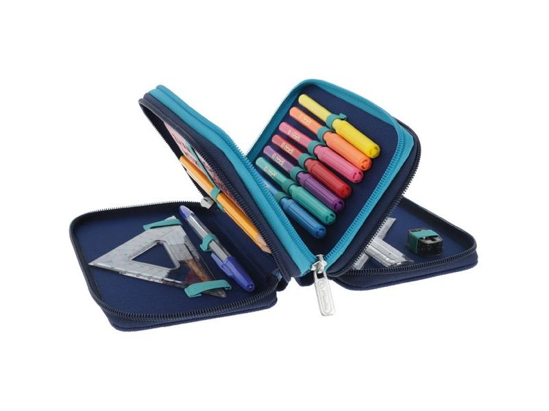 A Herlitz Mechanic 3 emeletes 31 részes töltött tolltartó leírása: 31 részes, 3 emeletes tolltartó 19x11,5x7 cm-es méretben, színben harmonizáló belsővel. Tartalma: 14 db filctoll, 1 db golyóstoll, 1 db radír, 1 db ceruzahegyező, 2 db grafitceruza, 8 db színesceruza, 1 db egyenes vonalzó, 2 db háromszög vonalzó, 1 db sablon vonalzó. Anyaga: poliészter.