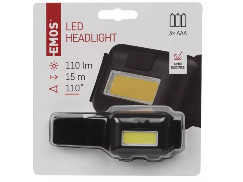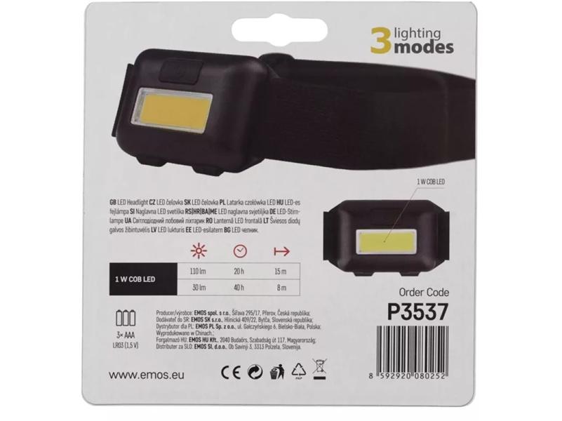 Az Emos P3537 COB LED 110lm fejlámpa leírása: fényforrás: COB LED, maximális fényárama: 110 lm, fényáram: COB LED 100 % 110 lm, COB LED 50 % 30 lm, max. világítási távolság: 15 m, világítási távolság: COB LED 100 % 15 m, COB LED 50 % 8 m, világítási üzemmódok száma: 3, üzemmódok: COB LED 100 %, COB LED 50 %, villog, világítási idő: 2040 h, üzemidő részletezés: COB LED 100 % 20 h, COB LED 50 % 40 h, sugárzási szög: 110°, fókusz: nem, fényvisszaverő szalag: nem, ütésállóság, vízálló: nem, tölthető: nem, táplálás: 3× AAA, akkumulátor típusa: LR03 (1,5 V), elem a csomag része: nem, anyag: ABS műanyag, szín: fekete, méretek: 60 × 40 × 18 mm, súly: 21 g/56 g, értékesítési csomagolás: 1 db, papírbliszter, garancia-időszak: 2 év