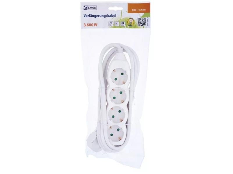Az Emos P0423R 4 aljzat 3méter 1,5mm2 fehér hosszabbító leírása: hossz: 3 m, aljzatok száma: 4× 2P + PE SCHUKO, feszültség/áram: 250 V~/16 A max., max. terhelés: max. 16 A, szigetelés típusa: PVC, szín: fehér, vezeték: H05VV-F3G 1,5 mm2, gyerekzár, az aljzatok és dugók anyaga: műanyag, értékesítési csomagolás: 1 db, akasztható, garancia-időszak: 2 év
