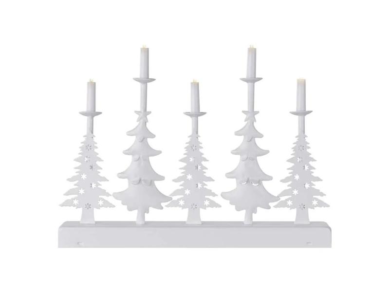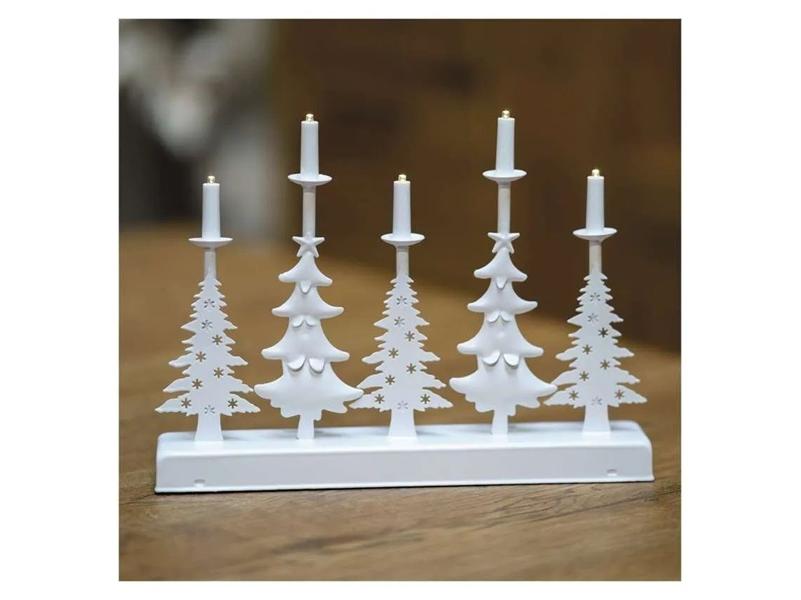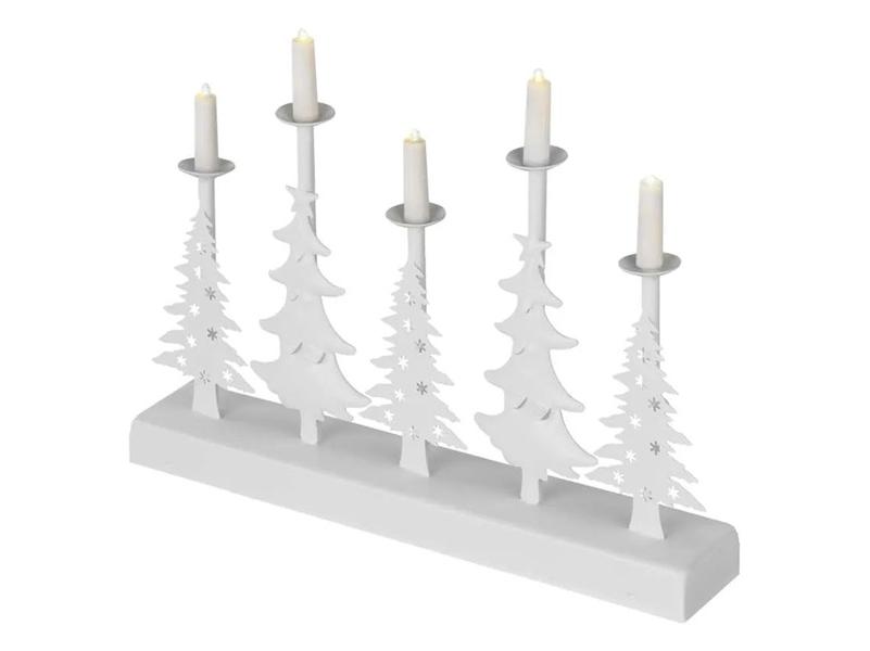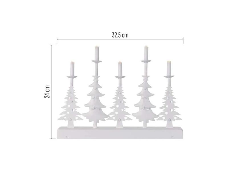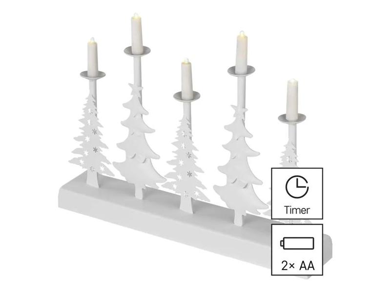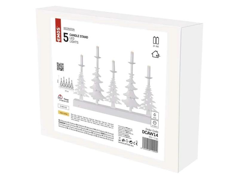 Az Emos DCAW14 24 cm 2x AA beltéri meleg fehér időzítős karácsonyfák gyertyákkal LED gyertyatartó leírása: termék: gyertyatartó, fény színe: meleg fehér, méretek: 32,5 × 5 × 24 cm, használat: beltéri, időzítő, távvezérlő: nem, tápellátás típusa: elem (2× AA), fényforrás: LED, LED-ek száma: 5, fogyasztás: 0,3 W, kimeneti feszültség: 3 V DC, védettség: IP20, élettartam: 10 000 óra, anyag: fém, garancia-időszak: 2 év, értékesítési csomagolás: 1 db, doboz
