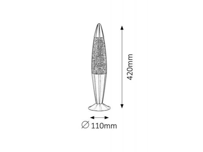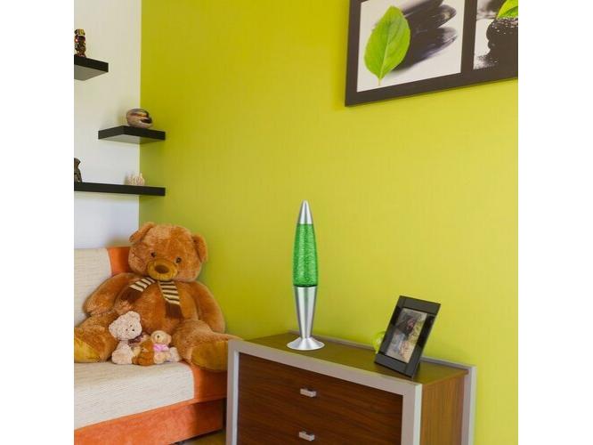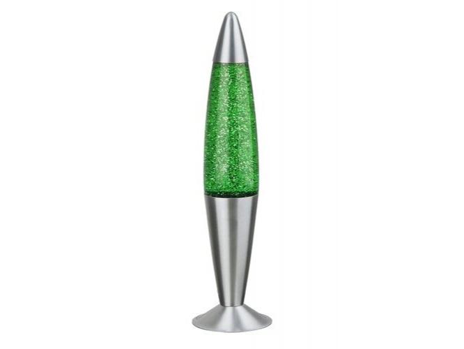A zöld színű hangulatfényt biztosító lavalámpa 1 db 25W fényforrással (a csomagban található), tápkábellel és kapcsolóval van felszerelve. Ezüst színű, fém világítótesttel, üveg árnyékolóval, 42 cm magassággal és 11 cm átmérővel rendelkezik. A díszvilágítás akár 25W teljesítményű, G45 hagyományos vagy halogén fényforrással, E14 foglalattal is használható. Az előmelegítési idő 3 óra.
